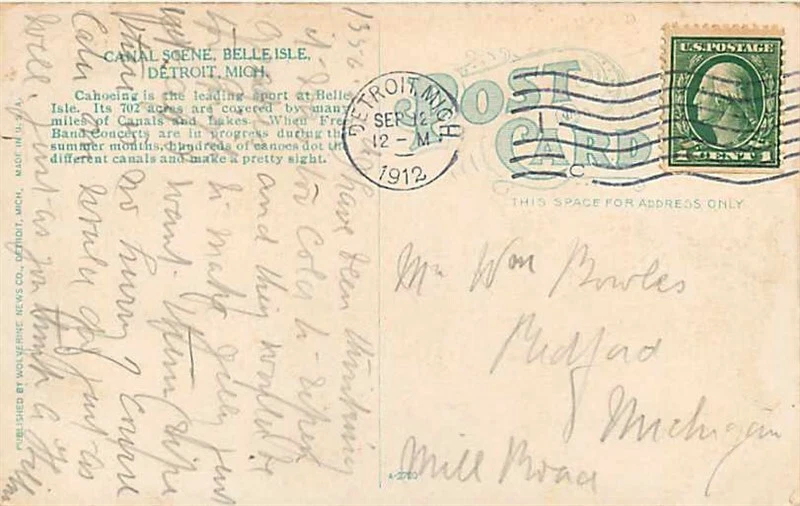 Detroit, Michigan, Belle Isle, Canal Scene Early Printed Postcard Postmark: 1912 Publisher/Printer: Wolverine News Image: Nice and clean Corners: Wear Faults/Other: Some edge wear top edge SKU: 39166N Powered by SixBit's eCommerce Solution