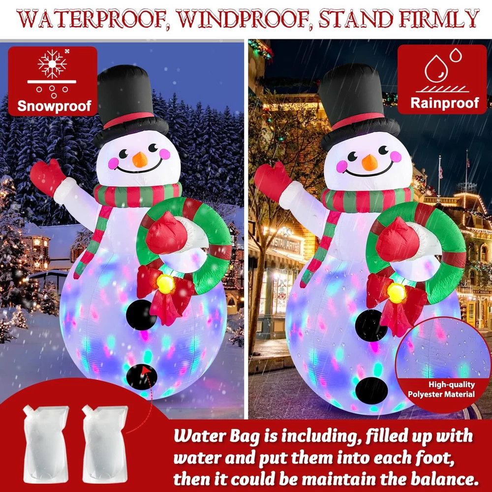 Large Outdoor Christmas Decorations: As Christmas neared, inflatable Christmas yard decorations outdoor with colorful and rotating LEDs will add VIBES To Your festive home! Our blow up snowman inflatable holding garland and waved with a sweet smile and warmly greeted the guests! Deliver New Year wishes to kids. Deck your house with 8 foot Christmas blow up yard decorations will become a popular photo spots Enchanting LED Lighting: Our 8-foot outdoor Christmas decor have built-in Rotating Colorful LED lights, look great at night and light up perfectly. We use High-quality lights to ensure long lasting use. You can put our led Christmas outdoor decorations yard in front porch, living room, roof, patio, garden, cafe, restaurant, hotel, mall, party, celebrations. Build an excellent and fun house for kids to celebrate the Xmas Very Stable for Outdoor Use: Provide a full set of Christmas blow ups installation components. MICOCAH inflatable Christmas decorations outside are fixed on the ground with 5 windproof stakes, 2 ropes and 2 waterbags are fixed so that it can stand. Don't worry that it will drift away in the wind. The powerful blower and continuous air flow inflate the Christmas outdoor inflatables and equipped with a box for you store Simple to Inflate & Store: Outdoor snowman decorations lighted will self-inflate in minutes when the blower works, you just plug it with standard electrical outlet, secure it to the ground. You can easily place and pop up the sonwman blow up Christmas inflatables anywhere you want in minutes. Don't forget to zip up the bottom zipper before inflated. Once deflated, its compact design makes storage easy and use for next Holiday Weatherproof & Durable: Our snowman outdoor Christmas decorations are made of 210T double-coated polyester PVC water-proof materials, ensuring Christmas inflatable snowman yard decorations can be used in rainy and snowy days. What's more, the vivid color won't discolor adopting spraying technology. MICOCAH blow up Christmas decorations outdoor yard have top quality and the seams are stitched well that resist tearing and durable