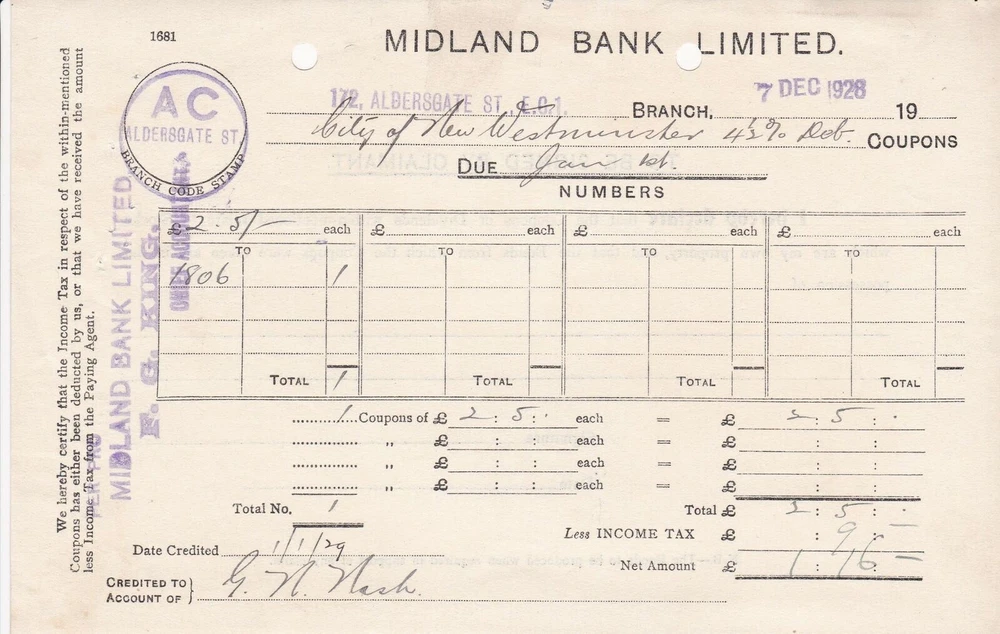 MIDLAND BANK LIMITED 1928 City of New Westminster Deb. Coupons Receipt Ref 45982