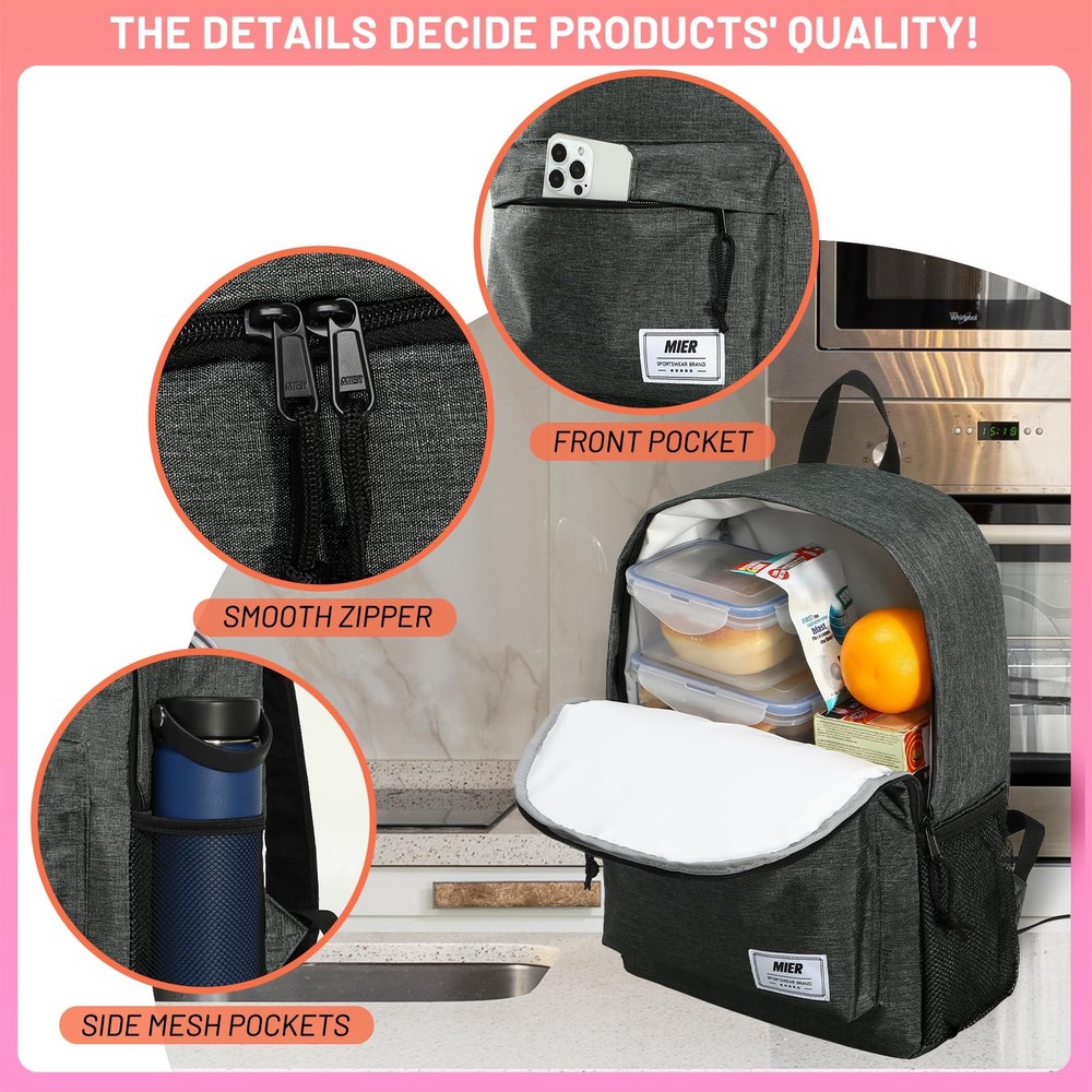 With modern simple style, multi colors available, MIER insulated backpack is ideal as a lunch bag, beach cooler or daily pack. Perfect for picnics, travel, camping, park, road trip, etc. It’s a best choice for women as a gift 【Insulated Cooler Backpack】: This Insulated back pack uses 5mm thicken insulation and food grade PEVA lining to keep foods cold or warm for hours. The exterior material-600D polyester & water-resistant fabric protects the contents from the rains or scratches 【Cute Lunch Back Pack with Simple Style】: This cooler back pack is designed with a classic day pack style. 1 main compartment is roomy enough for keeping drinks, tall beverages, fruits, lunch box and meal container fresh/ cold/ warm. 1 small front pocket can hold your your keys, wallet, coins, cards, etc. 2 side mesh pockets for your water bottles and umbrellas 【Durable and Comfy Backpack Cooler】: The adjustable padded shoulder straps are sturdy and comfortable to wear, and make it convenient to carry for long time. Heavy duty dual zippers and reinforced treatment on the stress points provide long-lasting durability against daily activities. The leakproof liner is easy to clean, just wipe it off with wet cloth or napkins 【Lightweight Lunch Backpack for Women】: Exterior dimension: 16.5*12*4.75 inch/ 42*30.5*12cm. Weight: 0.8 LB/ 370g. Capacity: 15 L. It is plenty of room for you to pack 1-2 person’s daily lunch. It can hold up to 16 cans of 330ml drinks and still have room for ice packs. Ideal as a lunch cooler, daypack for women 【Versatile Thermal Backpack for Your Best Choice】: With modern simple style, 4 colors available, MIER insulated backpack is ideal as a lunch bag, beach cooler or daily pack. Perfect for picnics, travel, camping, park, road trip, etc. It’s a best choice for women as a gift
