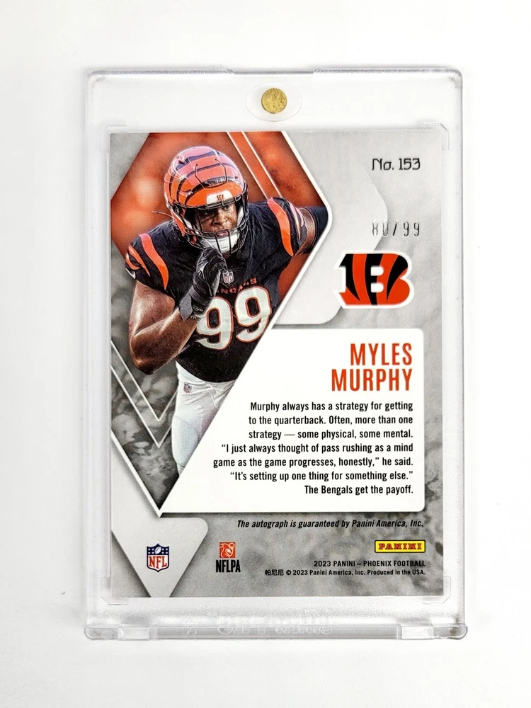 This rare and highly sought-after sports trading card features the autograph of Myles Murphy, a rising star in the National Football League (NFL) playing for the Cincinnati Bengals. The card comes from the 2023 Panini Phoenix set and is a limited edition, exclusive rookie card with a print run of only 99. In addition, this card boasts a Pink parallel/variety, making it an even more unique and valuable addition to any collection. It is authenticated by Panini Authentic and features a short print, adding to its rarity and desirability. Don't miss your chance to own this amazing piece of sports memorabilia! One touch not included. Card will be well protected and shipped in toploader case.