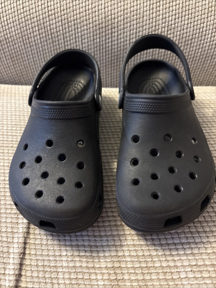 The product is a pair of kids' Crocs in size J3, featuring a classic clog style in black color. Designed with a slip-on closure, these unisex water shoes offer a comfortable and casual option for young wearers. The Crocs also include a platform sole for added height and style. Overall, these Crocs are in excellent used condition and provide a timeless and versatile footwear choice for unisex kids.