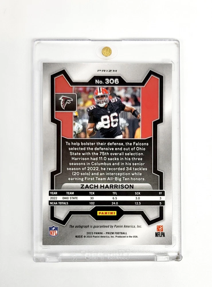 This is a rare and highly sought-after sports trading card featuring Zach Harrison, signed by the Ohio State Buckeyes player himself. The card is from the 2023 Panini Prizm set and is a limited edition autographed card with a silver parallel variety. It is a short print and exclusive rookie card, making it a valuable addition to any collection. The card number is #306 and it is manufactured by Panini. The card is designed with the NFL, National Football League (NFL) and Atlanta Falcons team in mind, making it a perfect gift for any football fan. The autographs prizm silver insert set adds to the card's uniqueness and makes it a must-have for collectors. This is a once-in-a-lifetime opportunity to own a rare and valuable sports trading card. One touch not included. Card will be well protected and shipped in toploader case.