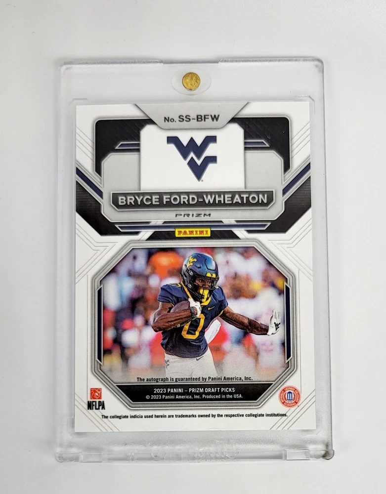 This rare and highly sought-after trading card features the autograph of Bryce Ford-Wheaton, a promising rookie from the West Virginia Mountaineers football team. The card comes from the 2023 Panini Prizm Draft Picks series, specifically the Sensational Signatures subset, and is a limited edition silver prizm parallel variety. It is a single-insert sports trading card that is original and authentic, manufactured by Panini America, Inc. The card attributes include "short print" and "exclusive", in addition to "rookie" and "insert", making it a valuable addition to any collection. With its stunning design and exceptional quality, this card is sure to impress any football fan. One touch not included. Card will be well protected and shipped in toploader case.