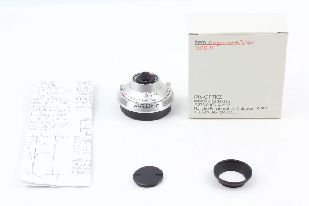 [MINT in BOX] MS-OPTICS H-DAGONAR MACRO 40mm f6.3 MC Lens for Leica M from JAPAN #03226 Description Total Condition; MINT Serial Number; 005 S Appearance; Appearance is beautiful. It shows minimal signs of use. *Please check photos. Optics; -Lens: Beautiful condition. There is no fog. There is no fungus. There is no balsam separation. There are no scratches. There are no large dusts. No problem in the shooting. Functional; It works properly. Bundled Items; Box. Front lens cap , Rear lens cap. Lens Hood. Instructions. All you can see on the picture will be included in a set of a package. Above condition is based on my own opinion. Please check the photo carefully. Please feel free to contact me for any questions! Thank you. Thank you very much for visiting. Please visit my store as well. There may be items you are looking for. Click here to see my store for more items.