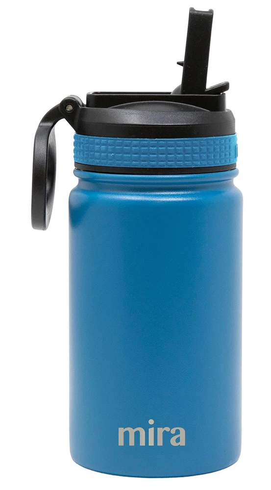 12 oz insulated, Stainless-Steel Water Bottle with Straw for easy and free sipping. Wide mouth opening for easy cleaning and filling ice. Leakproof when the nozzle is in the closed position Superior Double Wall Insulation keeps drinks cold for 24 hours or hot for 12 hours. Vibrant colors for all ages. Convenient carry loop for easy carrying. Cup holder friendly. Made from 18/8 food-grade stainless steel with a powder coat finish. Hand wash cup, dishwasher-safe lid. BPA-free materials for worry-free, sustainable hydration. Not recommended for hot or carbonated beverages