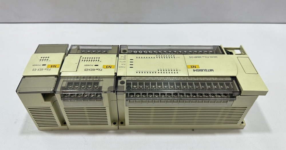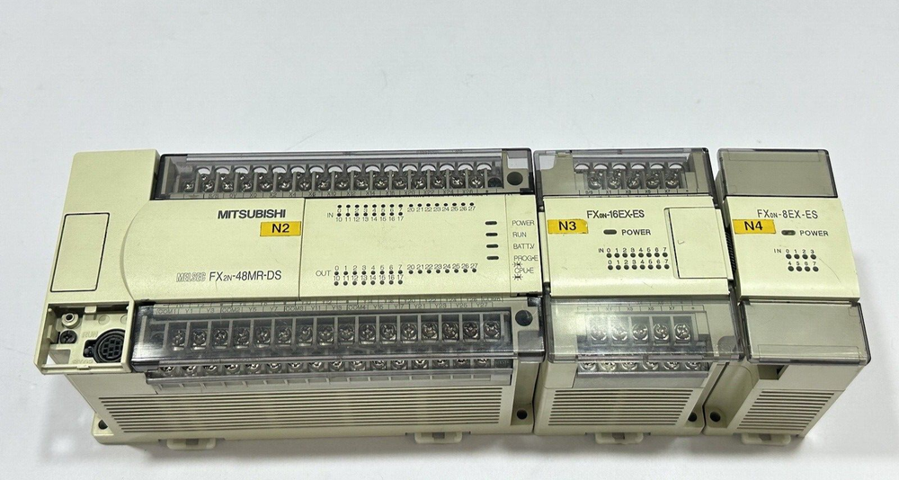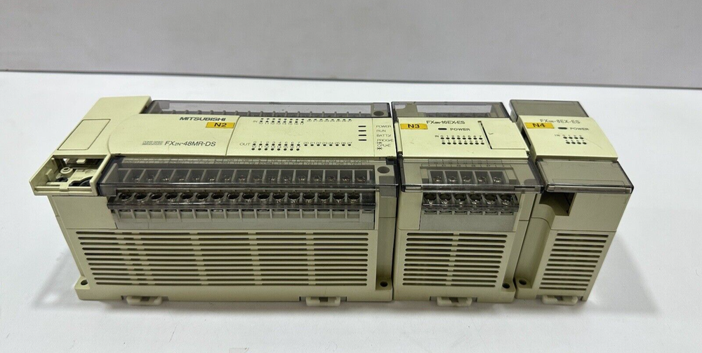 MITSUBISHI MELSEC FX2N-48MR-DS, FX0N-16EX-ES, FX0N-8EX-ES PLC RACK BRAND : MITSUBISHI MODEL : FX2N-48MR-DS, FX0N-16EX-ES, FX0N-8EX-ES MELSEC PLC RACK 24VDC 30W MAX IN : 24VDC 5mA SN : 4Y2020/ 4Y0229/ 4X3798 MADE IN JAPAN