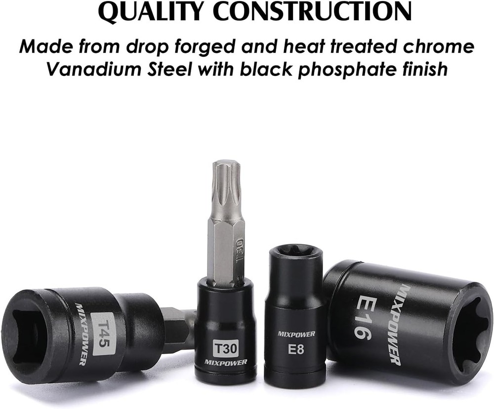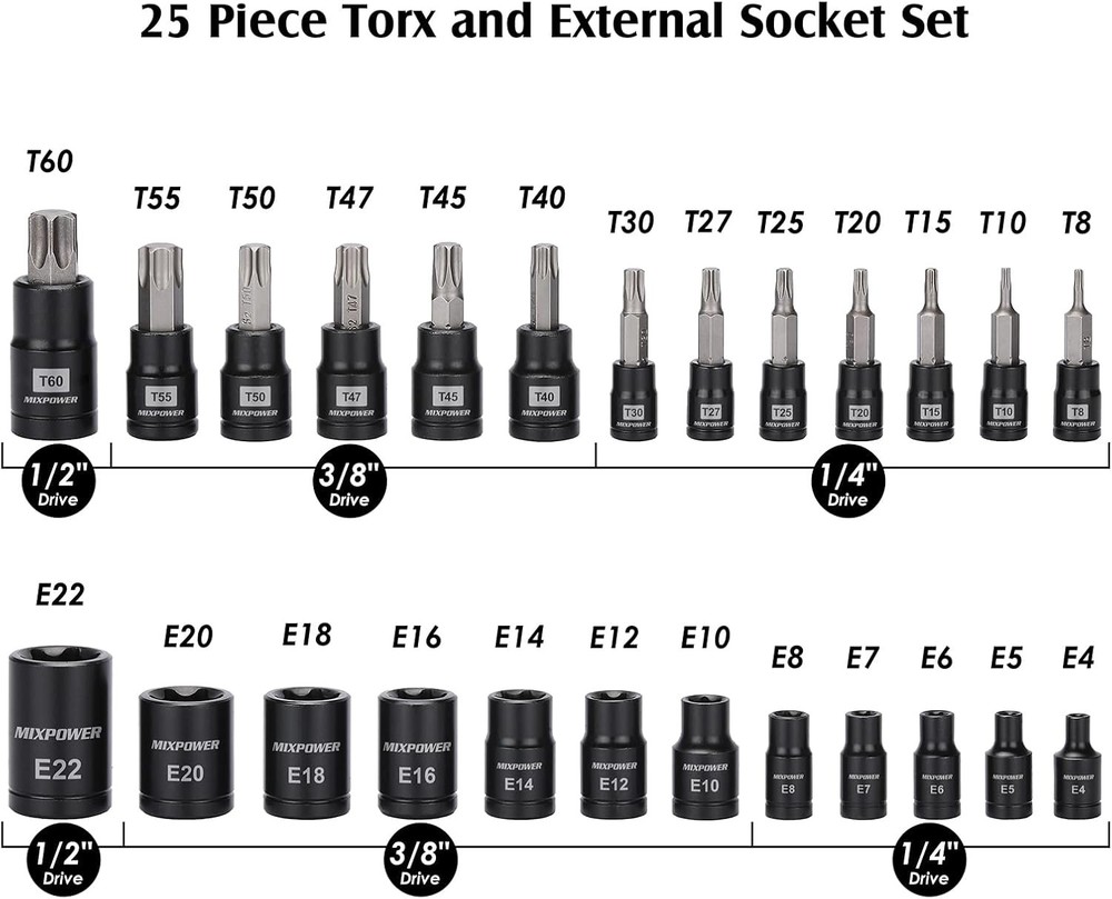 MIXPOWER 25 Piece Torx Bit and Socket Set, 13 Star Bits T8-T60,E4-E22(25PCS) Product Details Brand: MIXPOWER Material: Chrome Vanadium Steel, S2 Steel Drive System: Star, Torx Finish Type: Black phosphate finish Number of Pieces: 25 Manufacturer: MIXPOWER Part Number: MT078 Item Weight: 2.43 pounds Product Dimensions: 10.55 x 7.09 x 2.36 inches Item model number: MT078 Size: T8-T60,E4-E22(25PCS) Finish: Black phosphate finish Item Package Quantity: 1 Compatible Fastener Range: 0.25 inch Batteries Included?: No Batteries Required?: No Brand: MIXPOWER Material: Chrome Vanadium Steel, S2 Steel Drive System: Star, Torx Finish Type: Black phosphate finish Number of Pieces: 25 【Premium CR-V Steel】Made from drop forged and heat treated chrome vanadium steel (50BV30) with black phosphate finish. 【Set Includes】 13 Star Socket Bits T::1/4" Drive: T8, T10, T15, T20, T25, T27, T30; 3/8" Drive: T40, T45, T47, T50, T55, 1/2" Drive: T60. 12 Female E-Torx Sockets E: 1/4" Drive: E4, E5, E6, E7, E8; 3/8” Drive: E10, E12, E14, E16, E18, E20, 1/2” Drive: E22. 【S2 Alloy Steel Bit】Highest Quality Heat Treated S2 Alloy Steel Torx Bits, Drop-Forged to Help Prevent Wear-Outs and Improved Durability and Extra Torque. 【Laser Marking 】High-contrast size marking is permanently laser etched and easy to read, even in low light.