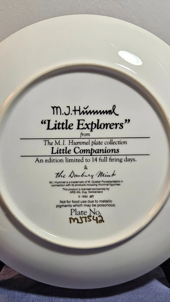 We are selling this beautiful 8 1/4" Hummel Plate from "The Danbury Mint". You are buying the "Little Explorers from the Little Companions collection". The plate is in excellent condition. Stand is not included. Please check out our other listings and if need be, we will combine shipping. We will ship the next day, if open and we only ship within the US. Thank you.