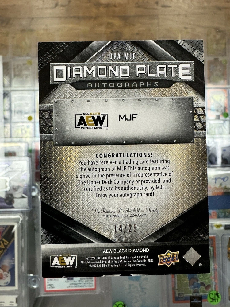 This exclusive sports trading card features MJF, a professional wrestler from All Elite Wrestling (AEW). The card is autographed by the athlete and is a 2024 Upper Deck AEW Black Diamond set Diamond parallel/variety. The card is limited to only 25 copies, making it a rare find for any sports trading card collector. The card is manufactured by Upper Deck and includes features such as the Diamond parallel/variety, making it a unique addition to any collection. This card is perfect for fans of MJF and sports trading card enthusiasts alike.