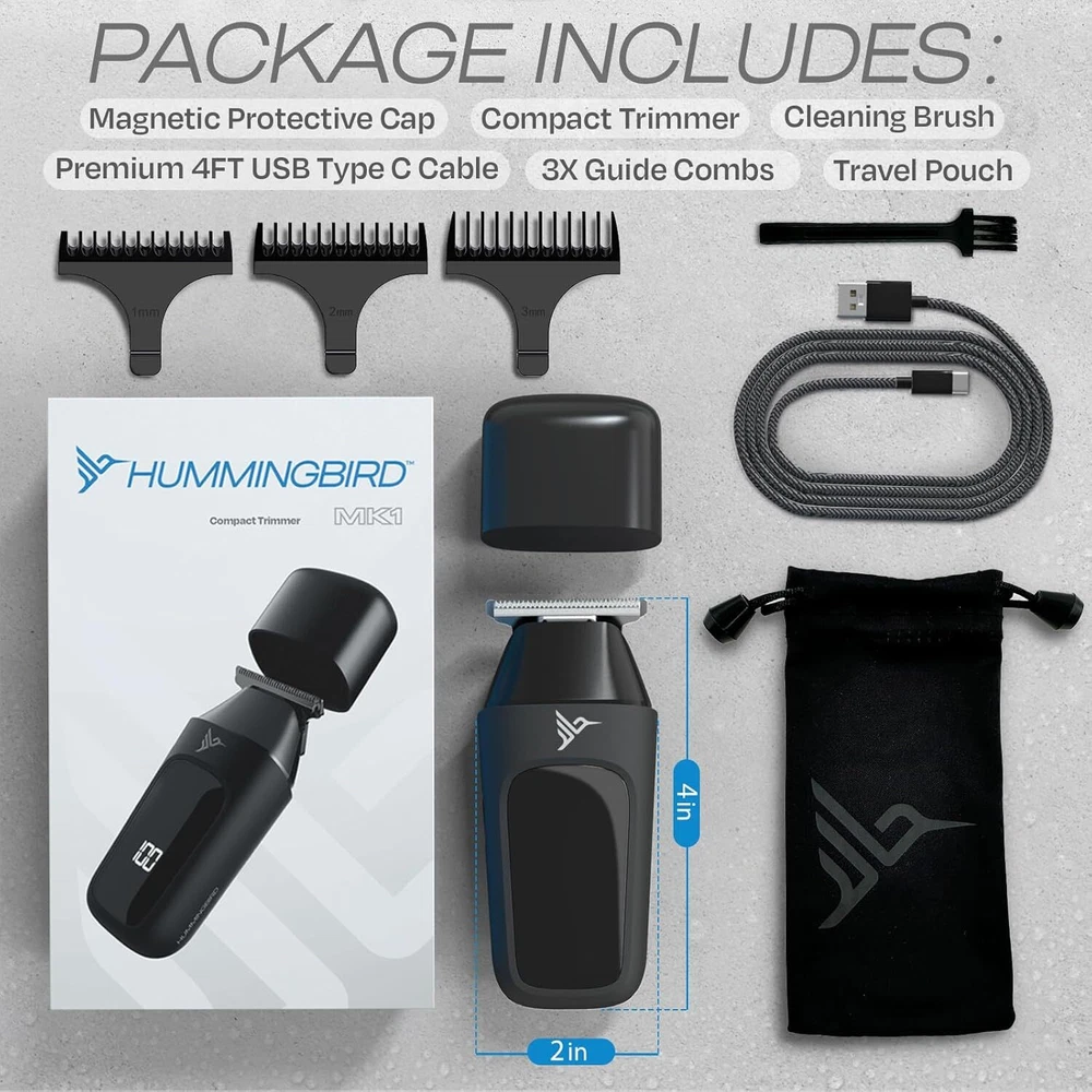 Product Description MK1 Compact Trimmer – Portable Men’s Travel Electric Facial and Body Hair Clipper, No Nick, No Cut, Cordless USB C Rechargeable, LED Display, Face and Body Groomer, Travel-Friendly Shaver PORTABLE DESIGN – The MK1’s pocket-sized design makes it your perfect grooming wingman for any adventure. Ideal for quick trims and clean-ups on the go or anywhere you may need it. Ergonomic design with a non-slip grip, soft, rounded edges and a magnetic protective cover keep it secure and snag-free in your pocket or bag. With its quiet motor and built-in intelligent travel lock feature the MK1 is the ultimate carry-on companion. ULTIMATE PRECISION – Engineered with hypoallergenic, self-sharpening, durable stainless-steel blades that deliver precise, clean cuts. The wide T-blade makes it ideal for detailed styling and finishing touches. From head and face to body hair, Forget about the frustration of nicks, bumps and cuts. LED BATTERY DISPLAY – 60 minutes of continuous runtime with a real time battery level display means you’re never caught off guard. The cordless, wireless design makes for unhindered movement and easy handling. Top off the battery life with convenient USB Type C quick charging. Allow 70 minutes for a full charge or just 5 minutes of charging for a quick boost to touch things up. INCLUDES – 4FT braided USB C charging cable, 3 guide comb attachments (1/2/3mm), magnetic protective cover, premium microfiber drawstring travel pouch and cleaning brush. For cleaning, rinse only the blade under running water and dry before using. The perfect gift for him: Dads, husbands, brothers, or best friends. Sure to put a smile on the face of any important man in your life. CUSTOMER SERVICE – At Hummingbird, our customers are our top priority and we're here to make sure you get the most out of your purchase! We’re based in New Jersey and our dedicated team is here to answer any questions or resolve any issues you may have. All products are covered by our one year warranty. About Us We are a reputable seller with many years of experience selling on eBay. Our goal is to provide high-quality products and excellent customer service. Shipping Items will be shipped within 1-3 business days when we received payment. (Orders are not processed on weekends & holidays) Tracking information will be sent once item is shipped. Delivery time depends on destination and other factors Item is shipped to ebay address. Leaving correct address can minimize delay. For international shipping and shipping to Guam, Hawaii and Alaska, Please contact us before placing the order. International buyers please note: Import duties, taxes and charges are not included in the item price or shipping charges. These charges are buyer’s responsibility. We will try our best to reduce the risk of the custom duties. Local pick-up is unavailable at the moment. Contact Us We reply any email messages within 1 business / working days(off-duty at weekend). If you do not get a response from us, then please check your junk or spam mailbox. Our Business hours: Mon-Fri 9:00-18:00, UTC/GMT +8 hours. Please contact us either by clicking "contact seller" in the "purchase history" section or simply click "ask a question" at the bottom of this page. If you are unsatisfied with our item or service, please contact us before leaving any feedback. We are committed to resolve all issues in a friendly and satisfactory manner.
