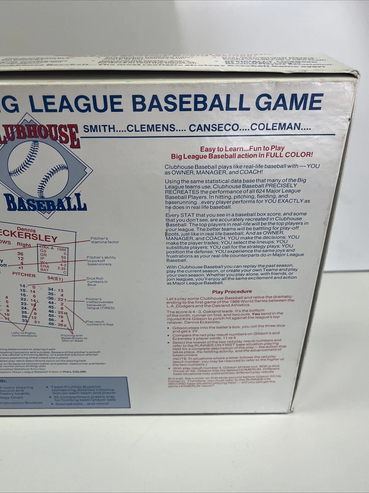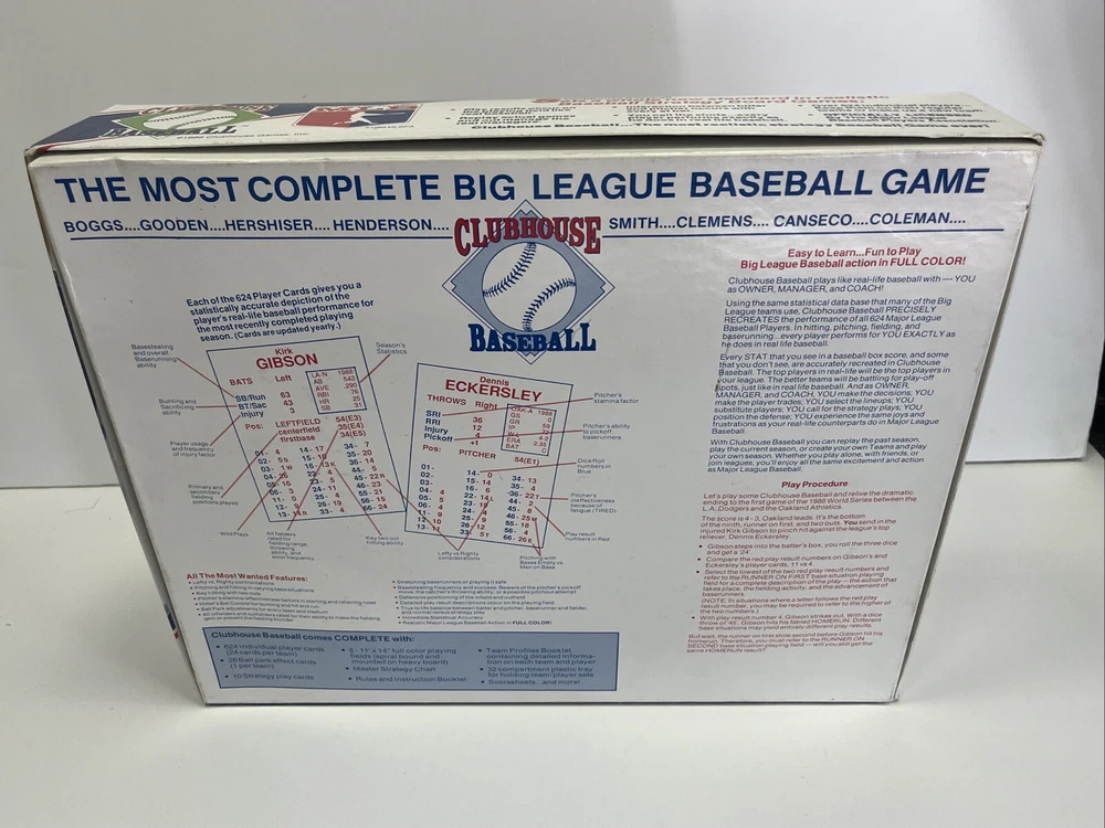 Game Title: Clubhouse Baseball Age Level: 12-16 Years, 17 Years & Up Year: 1991 Game Type: Board Game Min. Number of Players: 1 player Theme: Sports