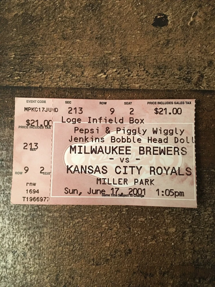 Original/Reproduction:OriginalUPC:Does not applyCountry/Region of Manufacture:United StatesTeam:Milwaukee Brewers vs Kansas City Royalsgtin13:Does not applyTeam-Baseball:Milwaukee BrewersSport:BaseballGrade:UngradedPlayer:Geoff JenkinsTeam-Basketball:NAVintage:YesTeam-NFL:NAModified Item:NoYear:2001Team-Hockey:NA