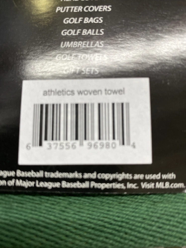 Set Includes:Sports TowelColor:GreenFeatures:WovenBrand:MLBTheme:Athletics, Oakland A's, BaseballCountry/Region of Manufacture:United StatesSport/Activity:GolfModified Item:NoNon-Domestic Product:NoCustom Bundle:NoMPN:Does Not ApplyMaterial:Cottongtin13:Does not applyType:Golfbag TowelUPC:Does not apply