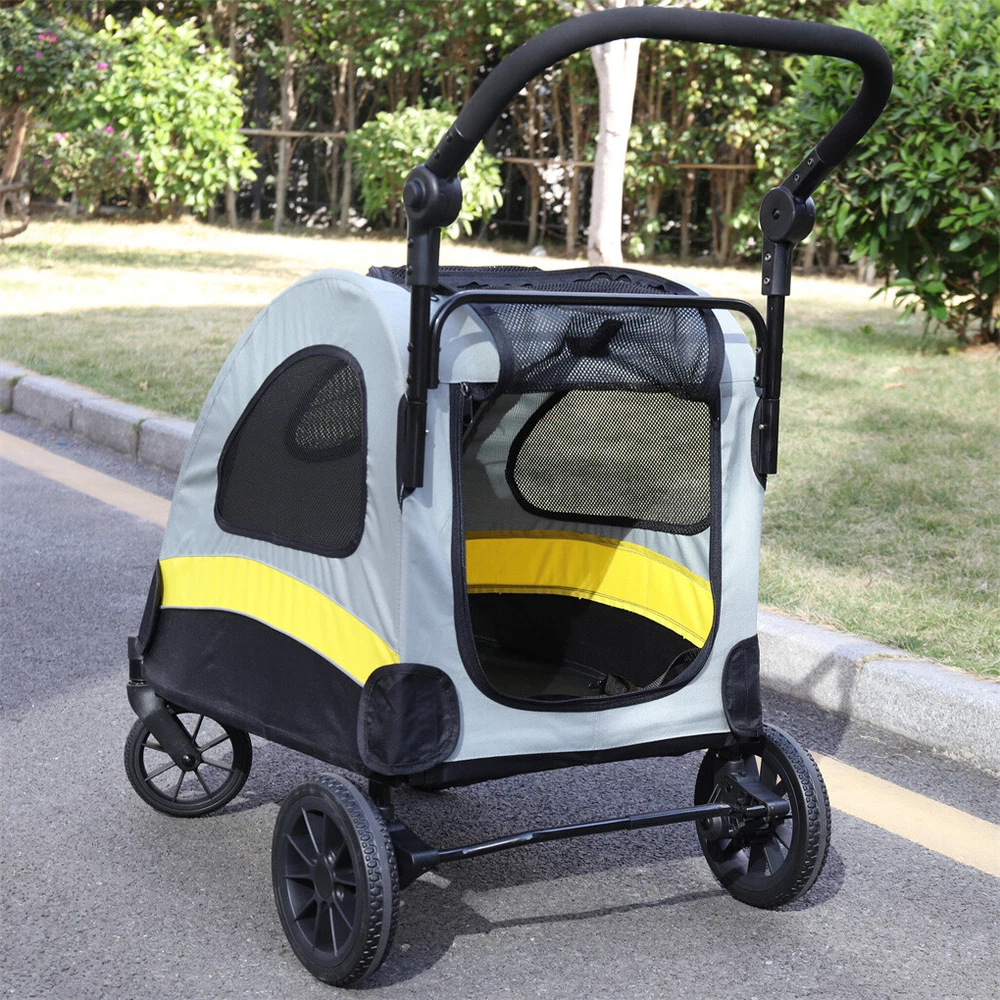 M/L/XL Large Dog Stroller Buggy Heavy Duty Pet Pram Doggy Pushchair Foldable US M/L/XL Large Dog Stroller Buggy Heavy Duty Pet Pram Doggy Pushchair Foldable US us seller, fast shipping. 【Functional Pet Stroller】 A pet stroller is perfect for injured, sick, paralyzed, rescued or elderly dogs with limited mobility, cats who suffer from anxiety and depression or love strolling around outdoors, it is a convenient accessory for owners can take them for walking or shopping 【Spacious Interior & Breathable】 The spacious interior and high weight-bearing ability make this pet stroller suitable for pushing one large dog or two small pets together. Breathable mesh cover for air flow, pets enjoy visibility via zippered panoramic windows and sunroof-style opening that allows them to stick their head out. 【Convenient Dog Stroller】 The zippered rear opening convenient for pets to go inside while they come out from the front openings. Spacious interior allows dog stay comfortably and move easily, the handle is covered with sponge foam to make it comfortable to grip and push, can be adjusted to 200°as per your stature 【Amazing 4 Wheels】 Comes 4 wheels, easy to maneuver and suitable for any kinds of road. The front wheels swivel 360 degrees, shock absorption, wear resistance. The rear wheels are lockable, brakes to prevent rolling accidentally, keep it parked safely wherever you want 【Safe & Stable Design】 Ideal for walking, shopping, hiking, picnics, busy parks or shopping areas. The stroller made with solid metal iron pipe for high strength and maximum stability, includes a safety collar hook inside to attach harness, prevent dogs running or out of control. Quick-folding mechanism that lets you fold conveniently and store it in the house or car truck Specifications: Feature: Foldable, Portable, Mobile, Large Material: 70% Iron Pipe + 20% 600D Oxford Cloth + 10% ABS Plastic Color: Multi-colored Net M: Net Weight: 6.41kg/ 14.13 lbs Weight Capacity: total 20kg/ 44 lbs Product Dimension: L * W * H 57x76x102cm/ 22.44x29.92x40.15 inch Folding Size: L * W * H total 57x76x23cm/ 22.44x29.92x9.05 inch Package Size: 71x51.5x15cm/ 27.9x20.3x5.9 inch Package Weight: 7.5kg/ 16.5 lbs L: Net Weight: 10.55kg/ 23.26 lbs Weight Capacity: 55kg Product Dimension: L * W * H 63x105x115.5cm/ 24.8x41.34x45.5 inch Folding Size: L * W * H 75.5x105x30cm/ 29.72x41.34x11.8 inch Package Size: 87x62.5x18cm/ 34.3x24.6x7.1 inch Package Weight: 12.15kg/ 26.8 lbs XL: Net Weight: 10kg/ 22 lbs Weight Capacity: 60kg Product Dimension: L * W * H 74x107x112cm/ 29x42.1x44.1 inch Folding Size: L * W * H total 74x107x33cm/ 29.1x42.1x13 inch Package Size: 90x75.5x16cm/ 35.4x29.7x6.3 inch Package Weight: 12.6kg/ 27.8 lbs Divider for two dogs : Net Weight: 10.2kg/ 22.5 lbs Weight Capacity: total 42kg/ 92.6 lbs Product Dimension: L * W * H 74x100x112cm/ 29x39.4x44.1 inch Folding Size: L * W * H 74x100x33cm/ 29x39.4x13 inch Package Size: 82x65x14.5cm/ 32.3x25.6x5.7 inch Package Weight: 11.7kg/ 25.8 lbs Package Included: 1 x Dog Stroller Pushchair 1 x Instruction Guide Note: * Please measure the body length of your pets before purchase. * Please make sure the size of stroller to fit into your door.