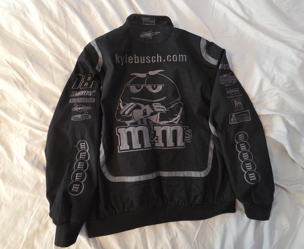 The M&M Racing Jacket #18 in Black Vintage NASCAR design by JH Designs is a rare and highly sought-after collectible for fans of Kyle Busch and the Joe Gibbs Racing team. Made in China, this officially licensed jacket showcases the driver's number and sponsors in gray against black in a stylish and unique design. The large XXL size makes it perfect for male NASCAR enthusiasts looking to show their support for the sport and their favorite driver in a standout piece of fan apparel. Other sponsors: Interstate Batteries Doosan Infracore Food Lion Shewing Williams Goodyear Sprint Cub Series Toyota NOS Energy Drinks Doublemint gum Pedigree Dog Food Snickers Siemens Sunoco Gillette