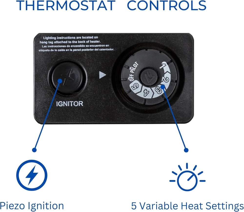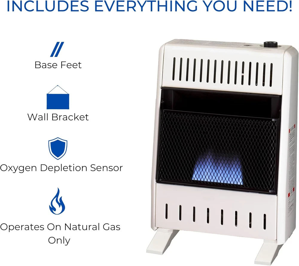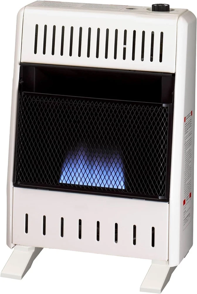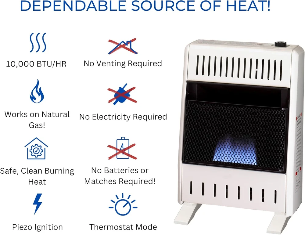 MN100TBA-B Ventless Natural Gas Blue Flame Space Heater with Thermostat Control TECHNOLOGY: This compact Blue Flame mini heater produces 10000 Maximum BTU using Natural Gas and heats up to 500 sq. ft. area; This is a great heater for office, bedroom, living room, and other residential use DEPENDABLE: Thermostat control on the heater offers High/Medium/Low Thermostat Control; Ideal for greater heat flow that could add a warm atmosphere as a small space heater STYLISH: Without compromising function for beauty, this versatile small heater has been redesigned for a slim & modern profile to effortlessly fit in your room; Mount on a wall with included hardware or place on a floor with Base Feet (Included) SAFE: Push button ignition with built-in pilot oxygen depletion sensor (ODS) immediately shuts down the garage heater if carbon monoxide or lack of oxygen is detected; ANSI Certified to ensure safety CONVENIENT: No electricity is required for this personal heater, making it perfect for power outages or any in-house emergencies; Includes Wall Mount and Base Feet ProCom Natural Gas Ventless Blue Flame Heater with Base Feet - 10,000 BTU, T-Stat Control - Model# MN100TBA-B 17.0 "h x 6.38 "h x 23.0 "h. Weight: 13.77 lb Item model number MN100TBA-B Style Natural Gas Assembly required No Number of pieces 1 Country of Origin USA Fuel Type Gas Room Type Bedroom, Home Office, Study Room Power Source Gas Powered Heating Method Gasoline Batteries required No Care instructions Hand Wash Burner type Radiant Heating Coverage 500 square_feet Form Factor Mat Heat Output 10000 British Thermal Units Included Components Ventless Blue Flame Heater with Base Feet Indoor/Outdoor Usage Indoor Item Weight 13.77 pounds Special Feature Overheat Protection Mounting Type Floor Mount Color White Recommended Uses For Product Office, Home Product Dimensions 6.38"D x 17"W x 23"H Size 10000 BTU