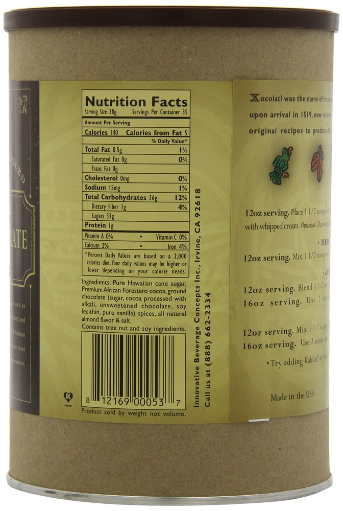 << The item is a Size 3 Pound (Pack of 2) >> Laced with Fragrant Spices such as cocoa liquor, real vanilla, almond, and cinnamon. Azteca D'oro 1519 Mexican Spiced Cocoa is the most flavorful cocoa found anywhere. 3 Pound (Pack of 2) Laced with Fragrant Spices such as cocoa liquor, real vanilla, almond, and cinnamon. Azteca D'oro 1519 Mexican Spiced Cocoa is the most flavorful cocoa found anywhere. All Natural||Serve hot, iced, ice blended, or with espresso to make a Mayan Mocha.||3lb canister makes 35 / 8oz servings||Just add milk