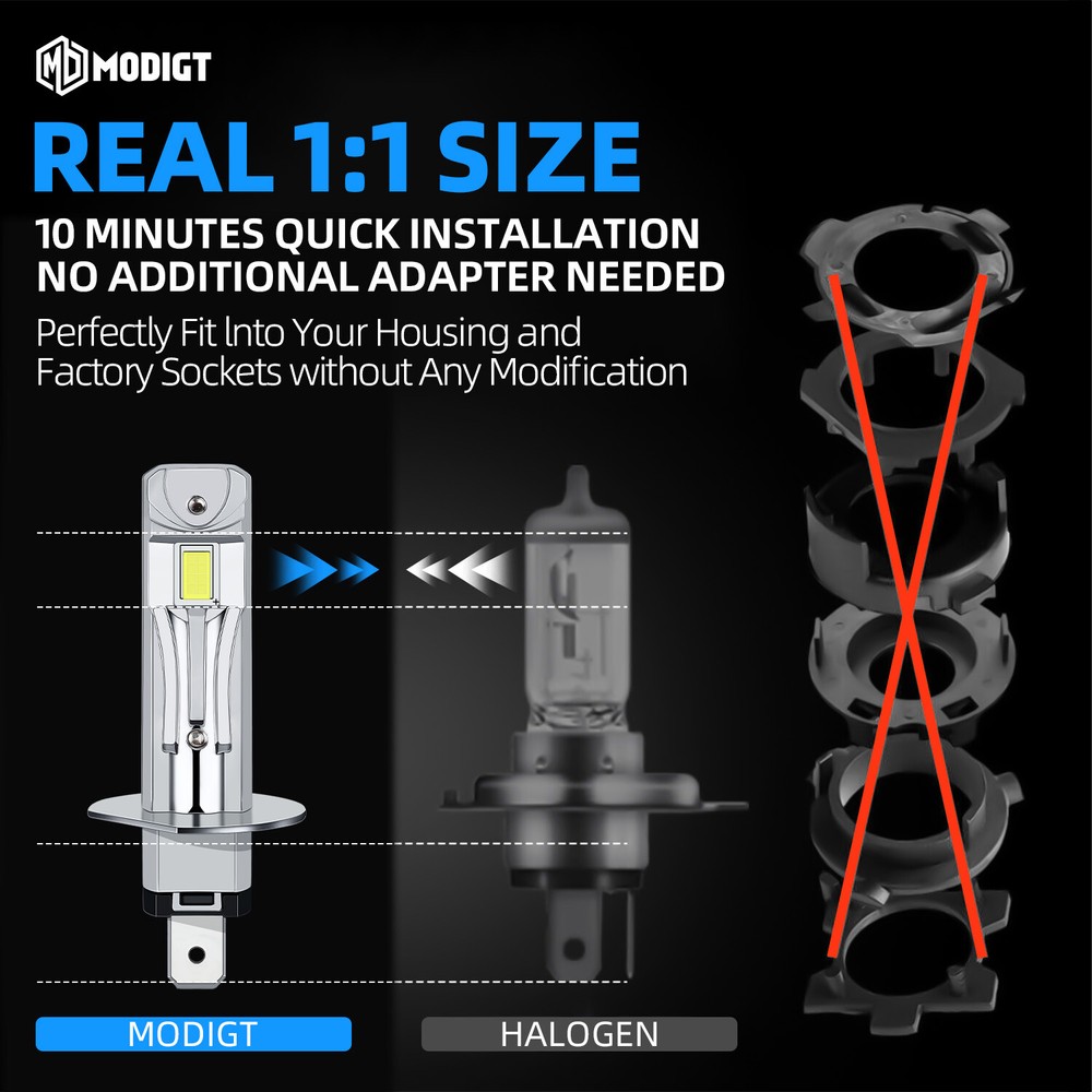 Feature: 【600% Brighter】MODIGT H1 LED headlight bulbs are designed with double-sided CSP LED chips, 6000K cool white, 22,000Lumen per set, 600% brighter than stock halogen bulbs, a perfect upgrade for halogen headlights. Allows driver get a farther, brighter, and clearer vision when driving at night 【30,000+hrs Lifespan】The advanced CSP LED technology effectively reduces the energy consumption of H1 Led headlight during operation. Premium aviation aluminum effectively pull the heat away from the LED chips, which ensures long service life of up more than 30,000 hours Breezesew Best choice of motor parts MODIGT H1 Super White 6000K LED Headlight Bulbs High Low Beam 22000LM Combo of 2 Feature: 【600% Brighter】MODIGT H1 LED headlight bulbs are designed with double-sided CSP LED chips, 6000K cool white, 22,000Lumen per set, 600% brighter than stock halogen bulbs, a perfect upgrade for halogen headlights. Allows driver get a farther, brighter, and clearer vision when driving at night 【30,000+hrs Lifespan】The advanced CSP LED technology effectively reduces the energy consumption of H1 Led headlight during operation. Premium aviation aluminum effectively pull the heat away from the LED chips, which ensures long service life of up more than 30,000 hours 【1:1 Beam Pattern】MODIGT H1 LED headlights 1:1 simulate the beam pattern of halogen bulbs, use ultra-thin 0.03in baseboard to ensure 360° lighting without black spots. And the emitted light beam is focused on the ground, will not cause glare to oncoming drivers 【5min Installation】Unlike other LED lights, MODIGT H1 headlight bulbs have no external driver and connector, fully all in one. That makes the bulbs almost the same size as the halogen bulb. Due to the wireless design, installation is a breeze, just plug and play Specification: Compatible With:H1 Power:20W/per bulb Lumens:22000lm Color Temperature:6000K White LED Chips: CSP Waterproof Level:Dustproof & Waterproof IP67 Operating Temperature: -40 - +80°C Lifetime:More than 30000 hours Work Voltage(V):DC 9V-32V(Fit 12V/24V vehicle) Applications:Headlight / fog driving light / daytime running light DRL Package Included: 2 x H1 LED Light Bulb Install Caution: 1. As a safety precaution, make sure that the car has had time to cool down properly before starting the installation process. 2. Put the vehicle into park or make sure it is securely in gear. 3. Make sure to have the ignition turned off and the keys removed. 4. Be careful to avoid burns, especially when turning on or off the vehicles lighting. 5. Be careful to avoid crushing or cutting the bulbs. Also make sure to not touch the bulbs with your fingers, as this will cause blotting. 6. Fully examine the connection of the contact points, ports and the wires as faulty connections can cause lighting problems. 7. Make certain that the end of the bulb does not come in contact with the interior light shield of the headlight when adjusting the bulb. Note: Please make sure it is suitable for your car before purchase. Please feel free to contact us if you have any questions. Item Specifics Brand MODIGT Lighting Technology LED To Fit Headlight, High or Low Beam Bulb Fitment Code H1 Number of Bulbs 2 Light Color Cold White Type H1 White LED Light Bulb Features Easy Installation Fitment Type Direct Replacement Material Aluminum Color Temperature 6000K Wattage 40 W Voltage DC 9V-32V(Fit 12V/24V vehicle) Lumens 22000LM Application headlight / fog driving light / daytime running light DRL Ballast Included No Operating Temperature -40℃~ 80℃ Bulb Life Hours Up to 30,000 Hours Manufacturer Warranty 2 Years Note Replace Halogen ONLY Payment 1. It will be much appreciated that you finish your payment asap or it will make UPI (unpaid item case) on your account leading to be suspended or restricted by eBay when those UPI cases carry over to certain amount. 2. Any problems please contact us for more details. Shipping 1. All items will be shipped to buyer's ebay address. 2. All items will be shipped within 24-48 working hours upon receipt of payment, and multiple items will be combined shipping. 3. In most cases, delivery takes around 3-5 business days, it's highly depended on the efficiency of the shpping carrier. If your item doesn't arrive on time, please contact us immediately for further assistance. Please note there is no local pickup service available. Returns If you are not 100% satisfied with your purchase, you can return the product and get a full refund or exchange the product for another one. Please Note: Please write us a message before your return, otherwise we will not accept the package. Any product you return must be in the same condition you received it and in the original packaging. Contact Us 1. We care about our valued buyers, if you have any questions, our Customer Service staff will be very glad to help you. We try our best to reply your ebay message as soon as possible, please kindly allow 24 hours for us to response. 2. Our goal is to make sure you are a happy buyer and pleasant shopping with us. Please contact us before leaving any 1 or 2 star ratings, negative feedback or open any dispute. We understand the concerns and frustrations you might have, and will do our endeavor to resolve the issues. Breezesew Best choice of motor parts MODIGT H1 Super White 6000K LED Headlight Bulbs High Low Beam 22000LM Combo of 2 Feature: 【600% Brighter】MODIGT H1 LED headlight bulbs are designed with double-sided CSP LED chips, 6000K cool white, 22,000Lumen per set, 600% brighter than stock halogen bulbs, a perfect upgrade for halogen headlights. Allows driver get a farther, brighter, and clearer vision when driving at night 【30,000+hrs Lifespan】The advanced CSP LED technology effectively reduces the energy consumption of H1 Led headlight during operation. Premium aviation aluminum effectively pull the heat away from the LED chips, which ensures long service life of up more than 30,000 hours 【1:1 Beam Pattern】MODIGT H