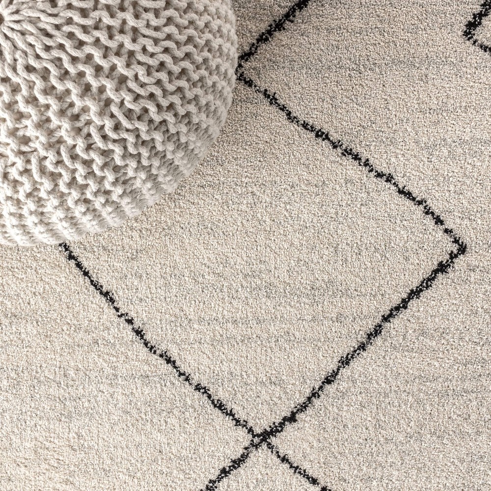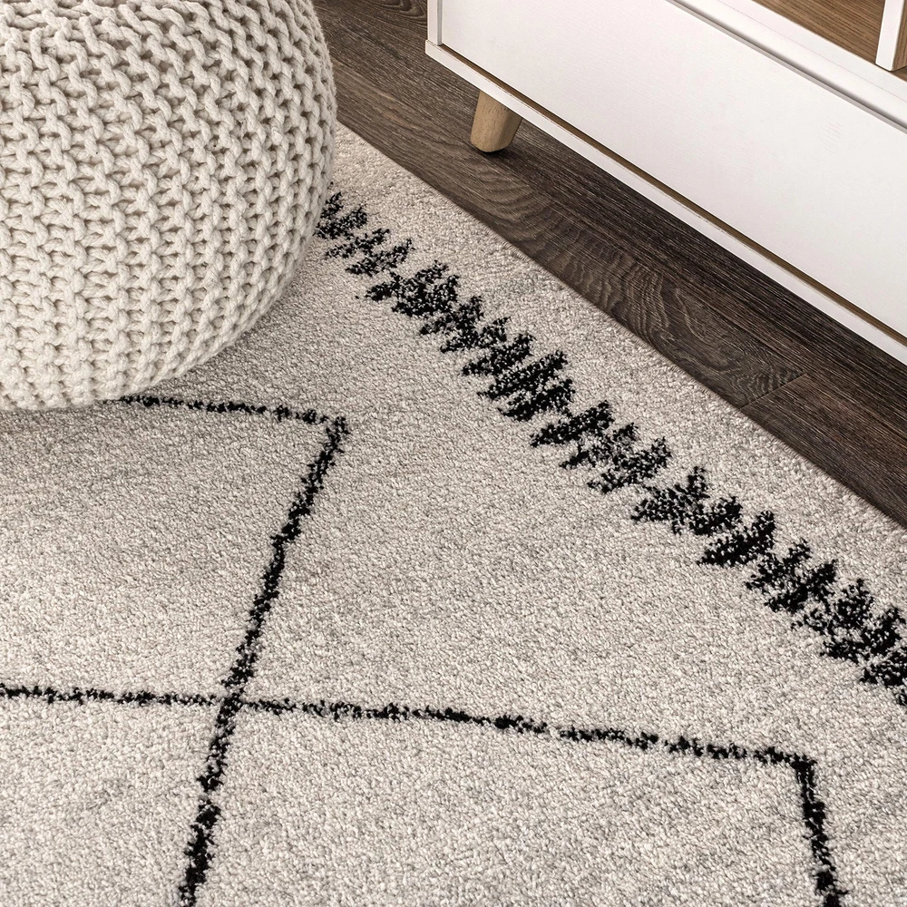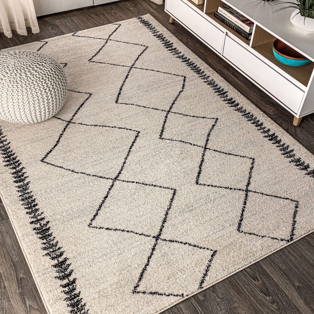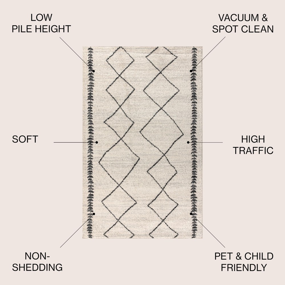 Inspired by vintage Beni Ourain Moroccan rugs, Our modern version is power-loomed with a short pile. Diamonds and geometric forms Are woven in black on a field of ivory; The mingled threads recall traditional handwoven rugs. Add some bohemian style to your home with this easy-care rug. PET-FRIENDLY AND DURABLE: Durable for high-traffic areas, soft and comfortable area rug perfect for families with ; Low-pile synthetic rug fibers won’t trap dirt and debris, so they’re pet-friendly and easy to clean STAIN-RESISTANT AND NON-SHEDDING: This rug is made from synthetic fibers that are water resistant, stain resistant; It’s been machine-woven so the rug fibers will stay put; When properly cared for, this rug won’t shed fluff into your home EASY TO CARE FOR: Vacuum regularly; Always raise or turn off the beater bars on your vacuum; Spot clean stains immediately with a mild detergent or carpet cleaning product, then rinse thoroughly and blot dry; Professional rug cleaning is recommended Low pile synthetic fiber construction with a jute backing for durability The ivory and black color scheme reproduces the look of neutral, vintage tribal rugs