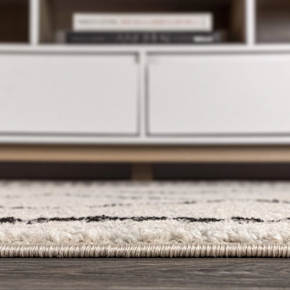 1. This rug is a gorgeous blend of boho charm and modern practicality! The ivory base with black geometric patterns adds a stylish yet timeless touch to any room. It’s super soft underfoot but durable enough for high-traffic areas—perfect for homes with kids or pets. The low pile makes cleaning a breeze, and it resists stains like a champ. Love how it brings warmth and texture without the fuss of a traditional Moroccan rug. A total win for both style and function!