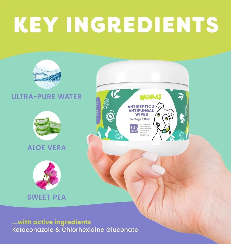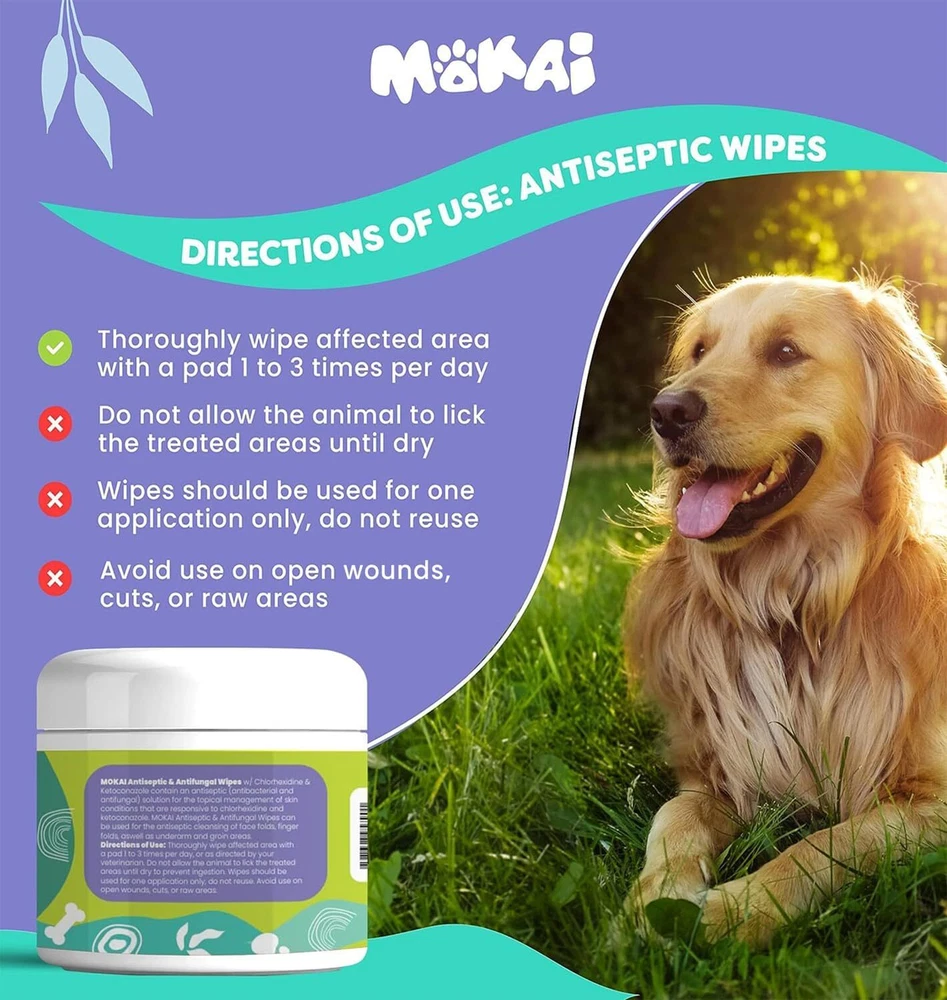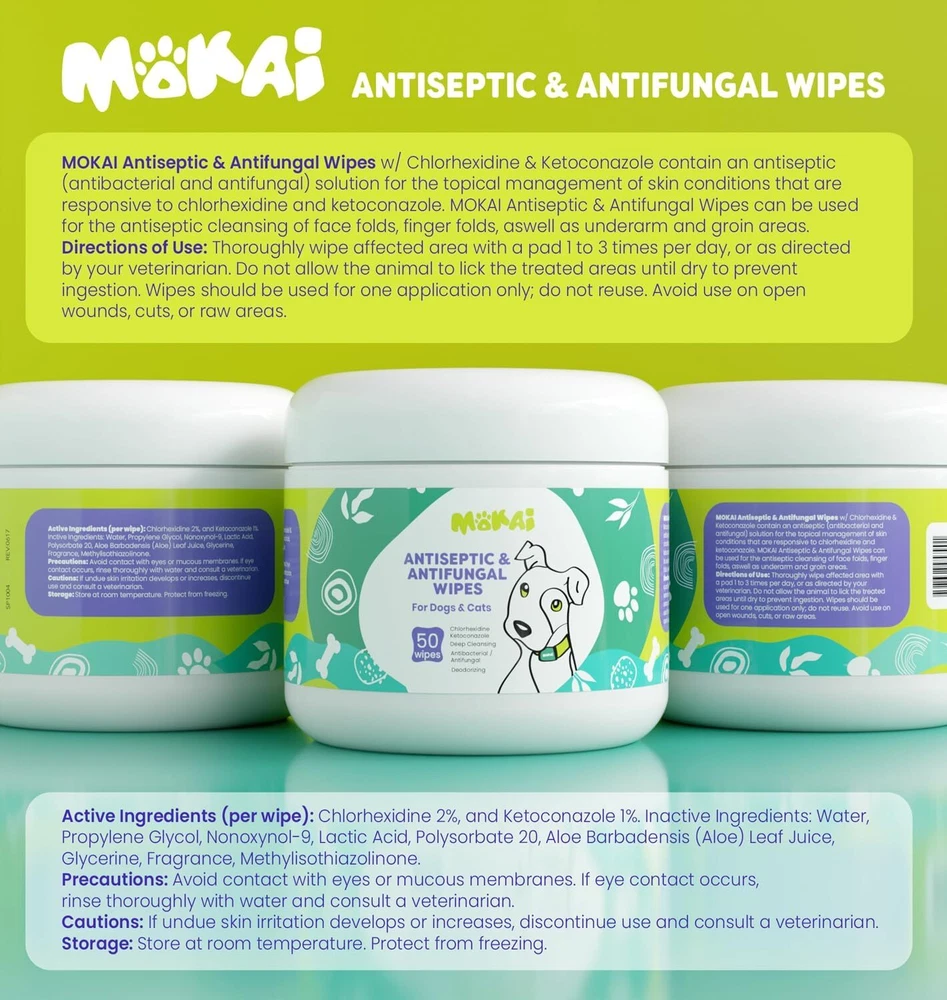 MOKAI Antiseptic Wipes for Dogs Cats and Horses | Dog X-Small, Product Details Item Weight: 3.2 ounces Manufacturer: MOKAI Item model number: MOKAI Item Package Dimensions L x W x H: 2.8 x 2.8 x 2.7 inches Brand Name: MOKAI Target Audience Keyword: small-animal-pets, dogs Directions: x Model Name: MOKAI Antiseptic Wipes for Dogs Cats and Horses | Dog Chlorhexidine Wipes with Ketoconazole Dermatological Pads Hot Spots Itchy Paws Skin Rashes Color: MOKAI Size: X-Small Age Range Description: Adult Number of Items: 1 Included Components: MOKAI Antiseptic Wipes for Dogs Cats and Horses | Dog Chlorhexidine Wipes with Ketoconazole Dermatological Pads Hot Spots Itchy Paws Skin Rashes Specific Uses for Product: MOKAI Antiseptic Wipes for Dogs Cats and Horses | Dog Chlorhexidine Wipes with Ketoconazole Dermatological Pads Hot Spots Itchy Paws Skin Rashes Is Discontinued By Manufacturer : No Package Dimensions : 2.8 x 2.8 x 2.7 inches; 3.21 ounces Item model number : MOKAI Manufacturer : MOKAI INSTANT SOOTHING RELIEF Our Antiseptic water based wipes for skin infections and dermatological conditions that cause burning and itching. ANTISEPTIC Our alcohol free antiseptic wipes contain Chlorhexidine and Ketoconazole to nourish the skin and control irritation, being effective when fighting bacteria and fungi. PROFESSIONAL GRADE QUALITY FOR HOT SPOTS ITCHY SKIN AND PAWS These wipes make treating hot spots and itchy skin or paws a pleasant experience for you and your pet! VET CHOICE MADE IN THE USA Proudly made in the USA, our antiseptic spray manufactured in Federally Regulated Manufacturing facilities, NASC inspected laboratory so you can trust the quality of our pet skin care products to Ensure Quality and Safety