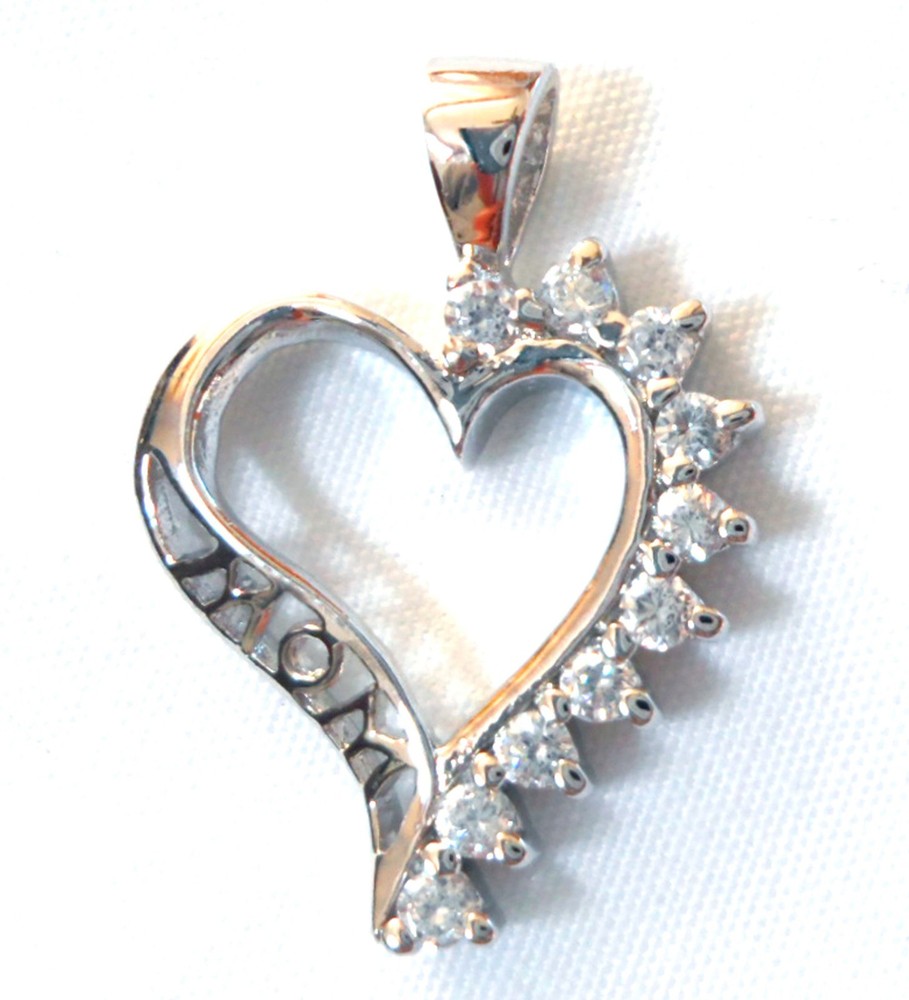 A Perfect Gift for all MOMs!! "MOM" Heart Pendant w/ CZ Gems BRAND NEW! HIGH-QUALITY .925 STERLING SILVER This wonderful PENDANT features: A lovely HEART-shaped design with "MOM" cut-out lettering. On the right side are 10 sparkling clear Cubic Zirconia gems. CZ gems are each 2-mm wide. Overall Measurements: 2.5-cm Long x 1.8-cm Wide Pendant is hallmarked with "925" for Genuine Sterling Silver. Pendant ONLY. Necklace chain is not included. Pendant bale/loop is large enough to fit standard size silver chains.