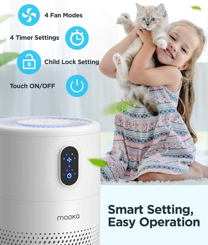 Color White Brand MOOKA Product Dimensions 7.1"D x 7.1"W x 11.1"H Noise Level 20 dB Particle Retention Size 0.3 Micron About this item MOOKA B-D02L AIR PURIFIER FOR LARGE ROOM: With the high-efficiency filtration system, the air purifier covers an area up to 1076 ft². 6 air changes per hour in 215 ft², 1 air changes per hour in 1076 ft². Modern design fits in any space from small to large rooms, bedrooms, living rooms, offices, nurseries, kitchens and basements. Perfect for pet owners, babies, children, the elderly, or anyone wanting to improve the air quality H13 TRUE HEPA AIR PURIFIER: The pre-filter, H13 true HEPA filter and high-efficiency activated carbon filter capture pet hair, dander, smoke, odor, and large dust particles, in addition to removing all airborne contaminants as small as 0.3 microns ULTRA-QUIET, ENERGY-SAVING & SAFE: Thanks to the new brushless motor, the 20dB noise level is almost voiceless. It cleans your air, doesn't affect your work, study or sleep. Running in low power makes it extremely energy-saving. Child lock prevents error operations caused by pets or children. The replacement filter should be replaced every 3-6 months depending on the environment and usage frequency 4 TIMER SETTINGS, 4 FAN MODES, AND NIGHT LIGHT: 4 timer options (1H/2H/4H/8H) allow you set the air purifier operating time. Adjust the required fan speed mode (Sleep/Low/Med/High) to capture as much air pollutants as required. Soft night light, that prevents falls, can be turned off to enjoy the perfect dreaming. Press the top power button for 3 seconds to turn ON/OFF the night light when the machine is running On Feb 20, 2025 at 00:54:23 PST, seller added the following information:
