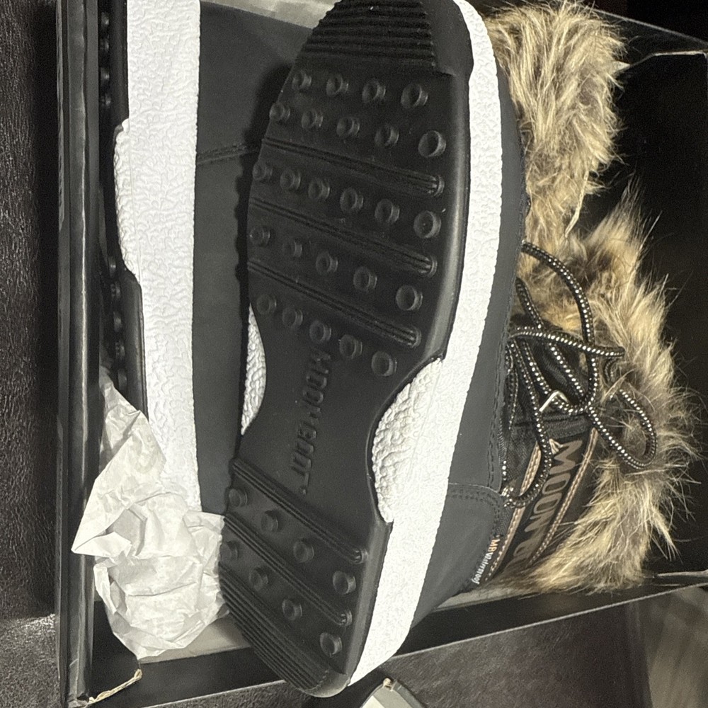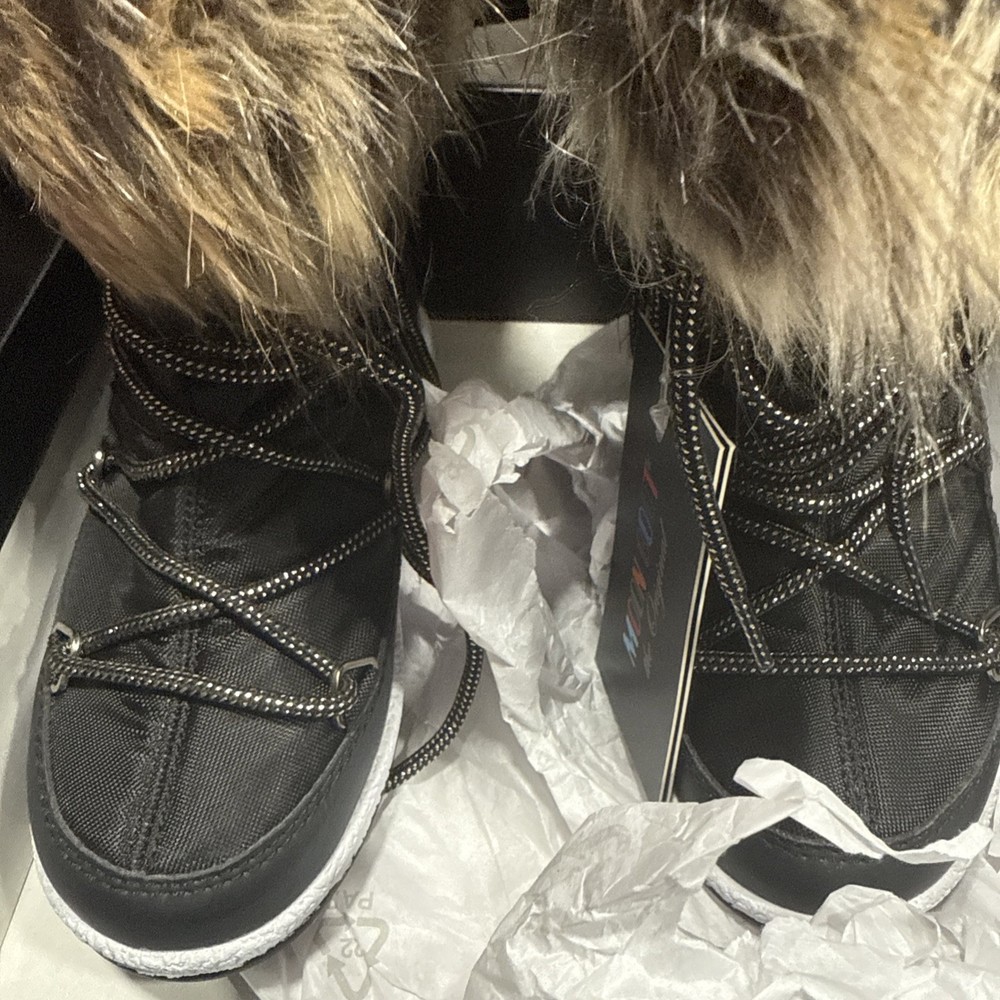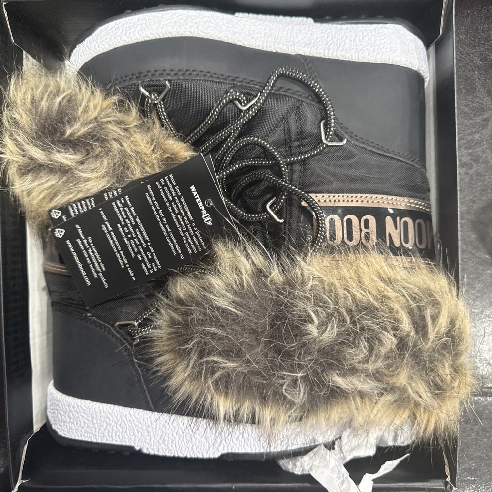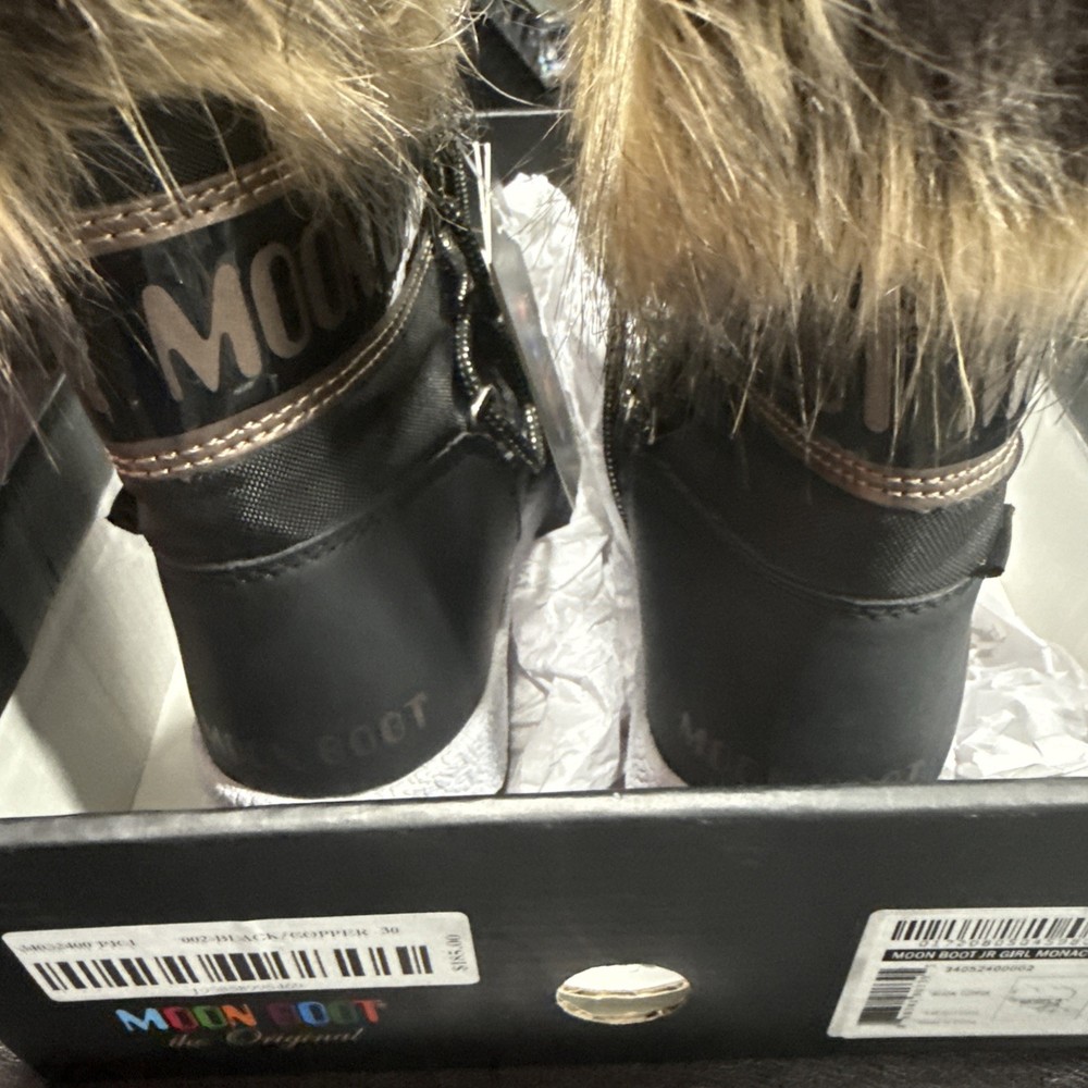The MOON BOOTS Monaco Kids Girls Boots in size 12.5 Kids are a stylish and practical choice for young girls. These black boots feature a durable metal cleat for enhanced traction, making them perfect for travel, activewear, and casual occasions. Made with breathable and waterproof materials, these boots are ideal for the winter, fall, and spring seasons. The textile lining and synthetic outsole provide comfort and support for everyday wear. With the signature Moon Boot brand and a trendy bootie style, these boots are a must-have for any fashionable young girl.