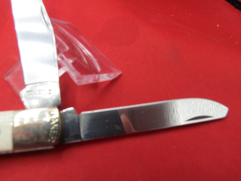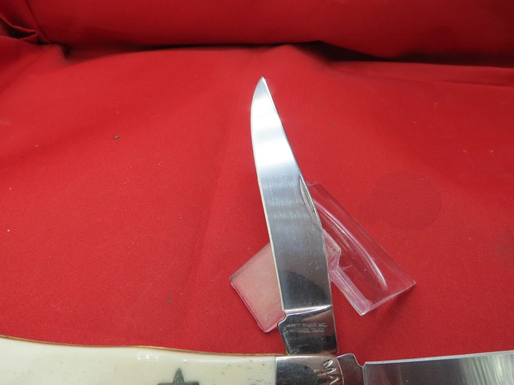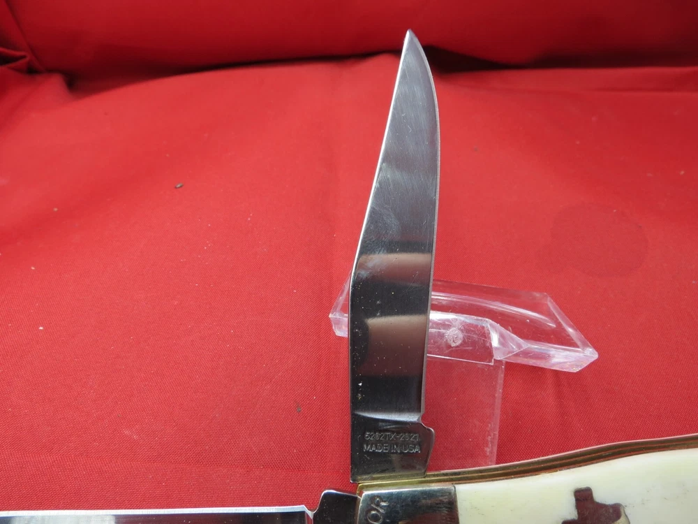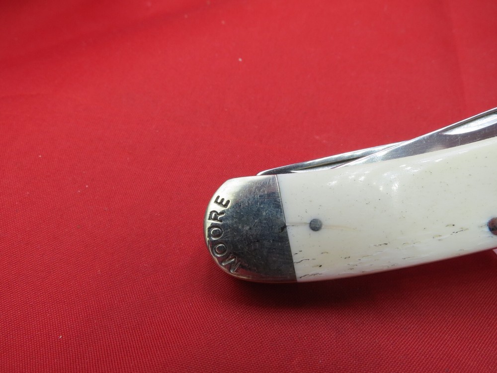 095 HC steel hardened to 56+/- 1 Rockwell Smooth Bone handles Moore Maker Stamped in Bolsters / Brass Liners Texas Shield on one side Lone Star on the other 4-1/8 inches closed WE KNOW YOU HAVE A CHOICE WHERE YOU SHOP… THANKS FOR SHOPPING WITH US AT NO PRESSURE SALES,LLC PLEASE BE SURE AND VISIT OUR OTHER ITEMS Thanks for looking YOU WILL RECEIVE THE ITEM PICTURED UNLESS IT IS A MULTIPLE LISTING OR OTHERWISE STATED.ALL BONE KNIVES COME FROM BOVINE (COW) BONE UNLESS OTHERWISE STATED !!