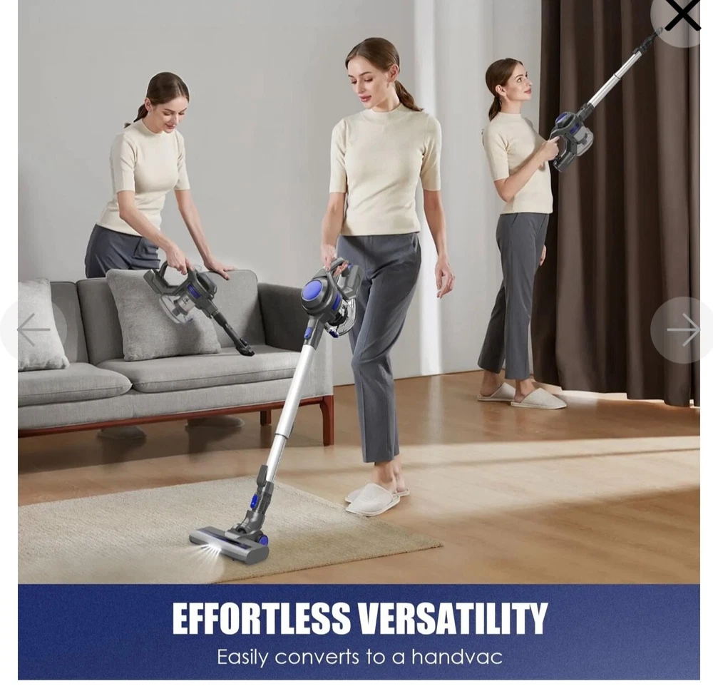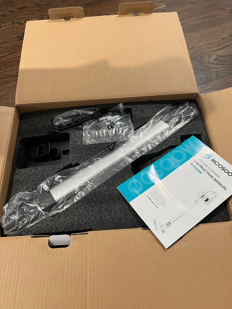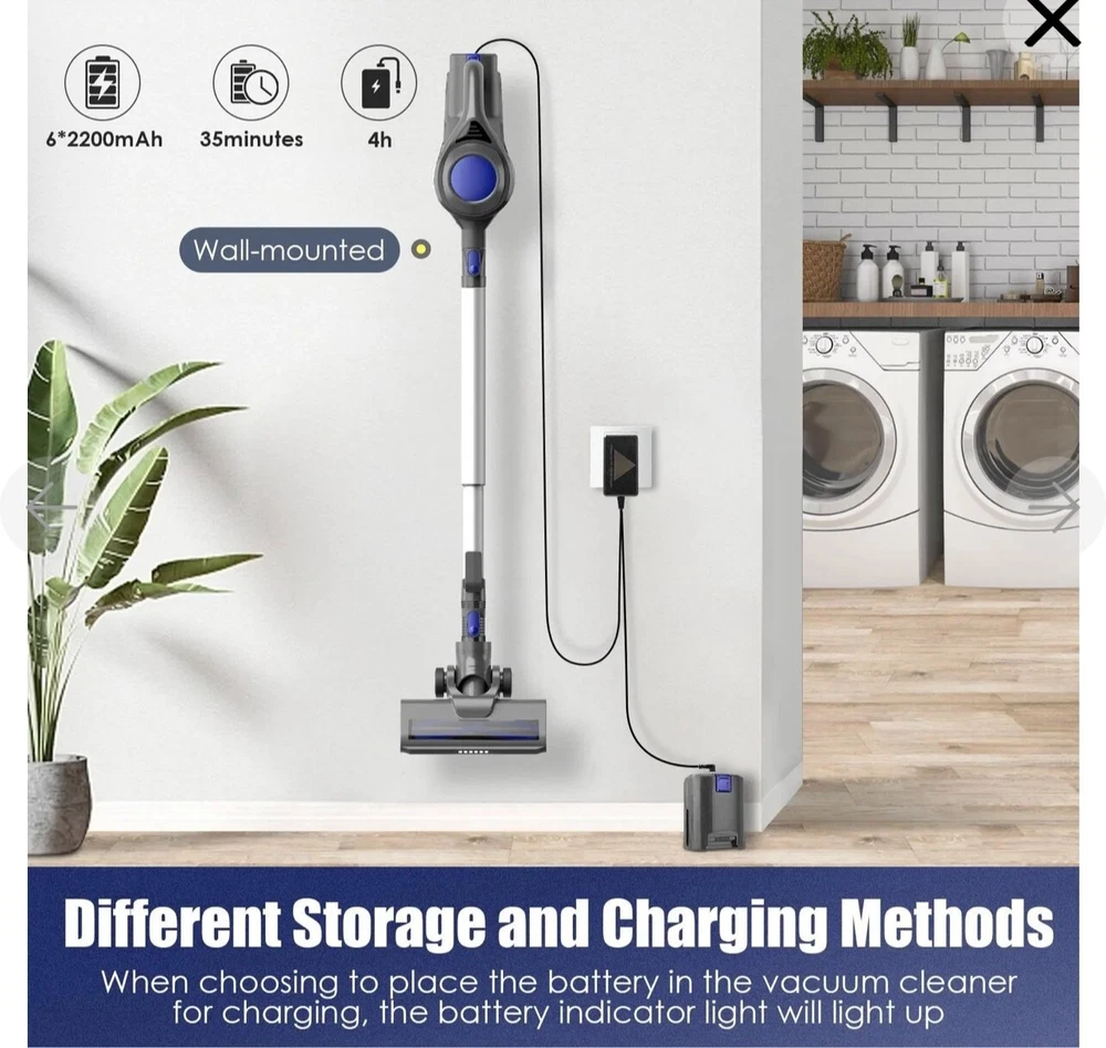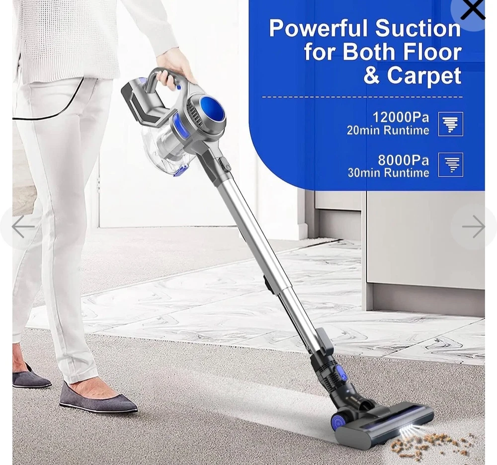 This is Open boxes item, but everything else are new inside the box. free shipping with usps Moosoo XL-618A: Cordless Vacuum 4-in-1 Lightweight Stick Vacuum Cleaner - Blue [Super Long-lasting Battery & Powerful Suction]: Outstanding 20-35mins CORDLESS running time ensures thorough cleaning all around the house. The upgrade version provides 120-watt powerful suction to meet every cleaning demands, picks up debris and dusts, crumbs and pet hairs in minute. It performs well on all kinds of hard floors, carpet, stairs and windowsills, sofa and bed, desk and curtain, etc.i [High-efficiency Cyclone + HEPA Filtration System]: It creates a high speed rotating airflow to remove particulates from air. Plus high-density HEPA which removes up to 99.99% of microscopic dust particles as small as 0.1 microns, this vacuum cleaner provides ultimate purified air and excellent cleaning experience for every users. HEPA is washable and recyclable [Convenient Cordless Using + Widely Applicable Two Modes]: Wireless design makes you away from the hassle of cord and still provide up to 10000PA powerful suction to complete a thorough cleaning. 2 adjustable modes adapt to different situations and allow full use of the battery [Lightweight Main Machine + Detachable Battery]: The main machine weights only 3.3lb which can be equipped with different attachments for different tasks. With an ergonomic handle, people can hold the machine to finish cleaning . 2200mAh large capacity battery can be full charged in 5 hours [What You Get]: MOOSOO vacuum cleaner*1; Motorized floor brush*1 (features Led light for dirt seeking); 2 in 1 dusting brush*1 (for both narrow gaps cleaning and wide variety of dry pick up tasks); light aluminum alloy tube. *1; AC power adapter *1; 2200mAh battery *1; wall bracket *1; cleaning tool *1; user manual