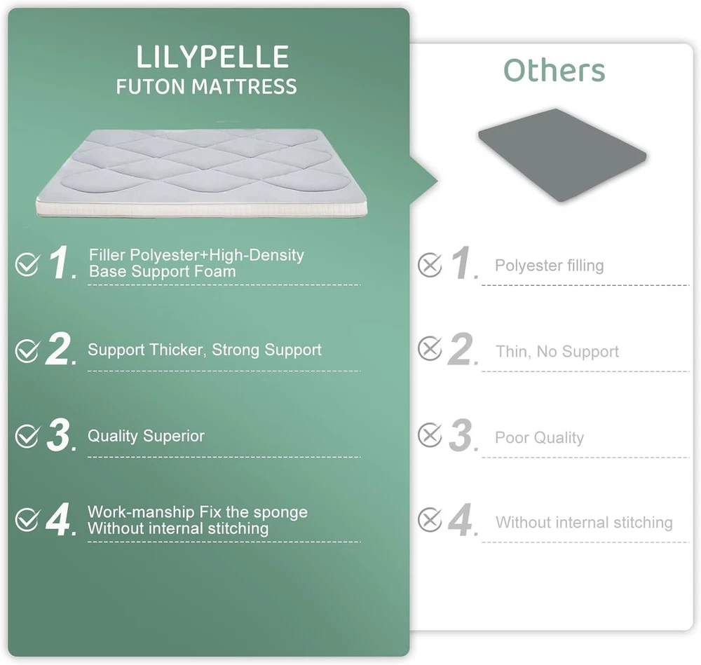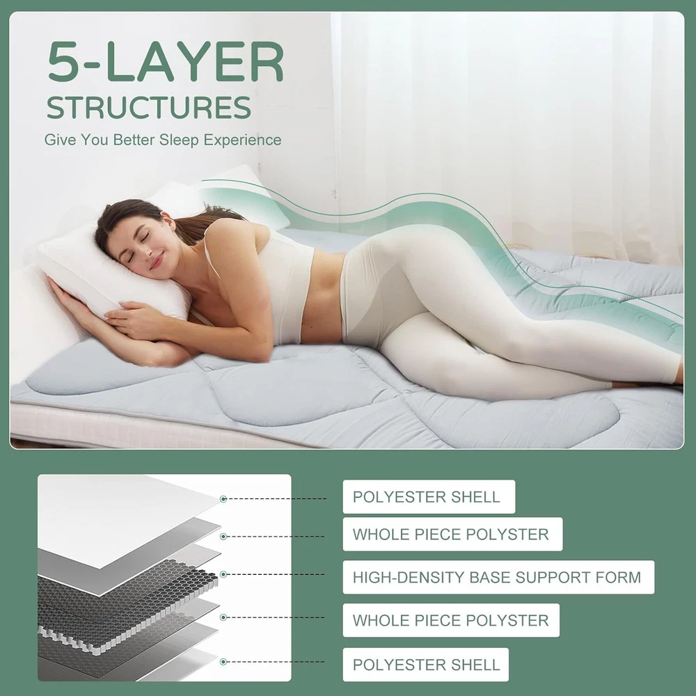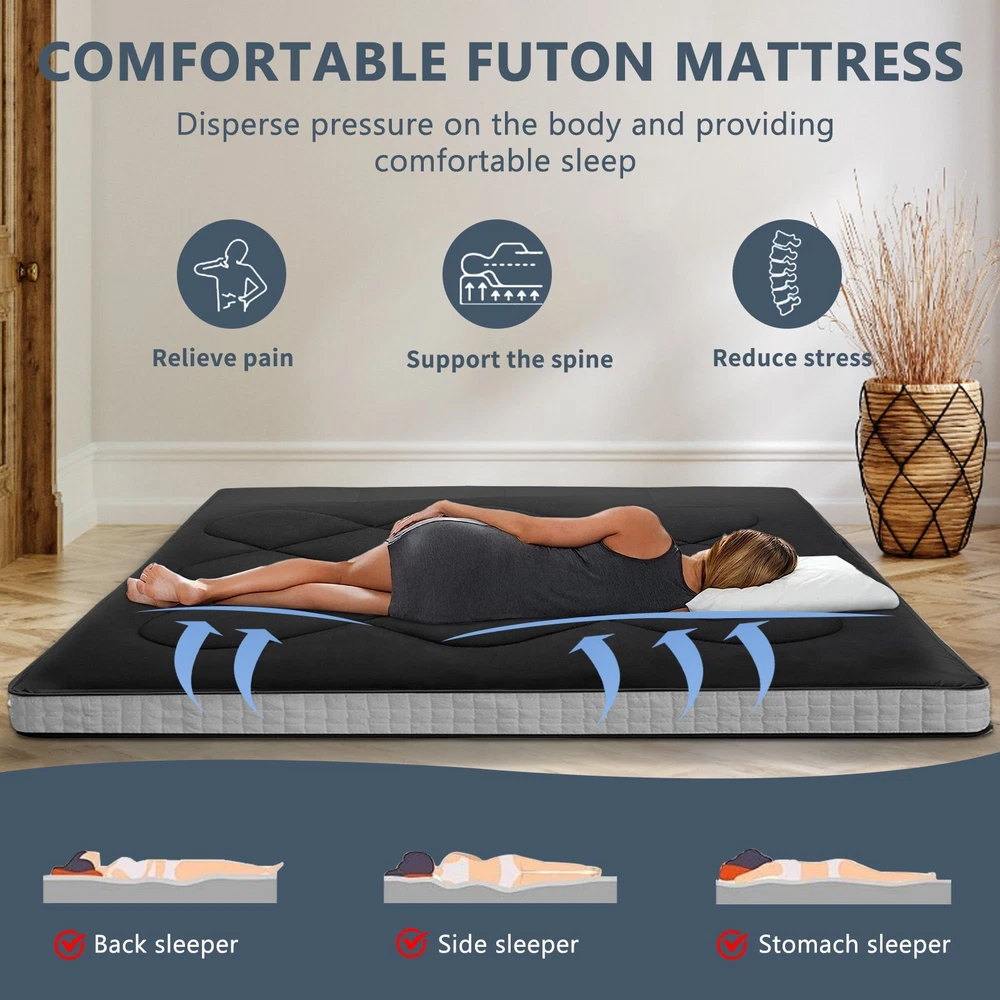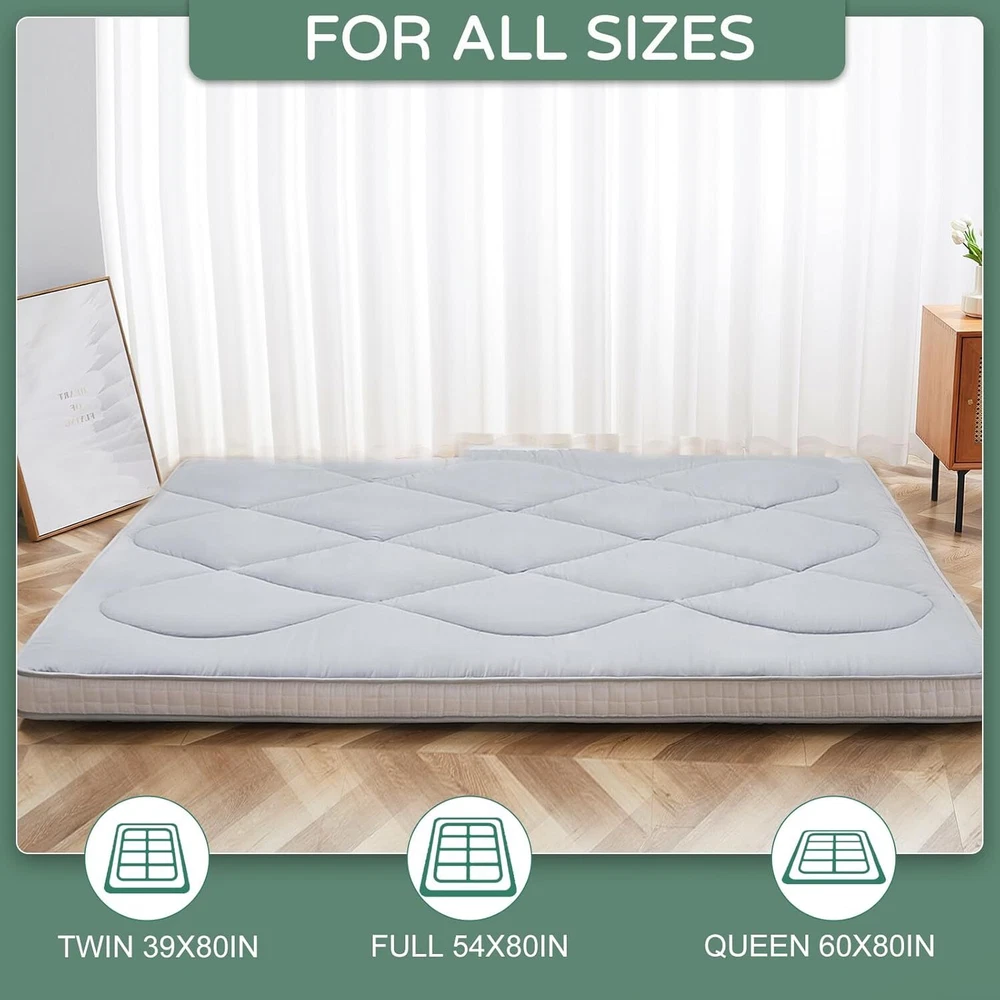 UPGRADED JAPANESE FLOOR MATTRESS- Different from the old version of the floor mat with straight edge seam, our new tatami mattress added high density memory foam. The structure of the Futon Mattress is more stable and provides better support. Perfect for either directly as a floor bed or bed mattress topper; PREMIUM MATERIAL- Our Japanese Floor Mattress has a five-layer design that is skin-friendly, comfortable, and breathable. The combination of memory foam and additional padding filled in the mattress is not only soft, but also provides good support for your body, relieving your stress and making you extremely relaxed and comfortable; FINE WORKMANSHIP- The pattern is made very delicately and thoroughly but with strong, firm thread. The borders of the mattress are hemmed to make it more structured and intact. The floor mattress has three sizes: Twin/Full/Queen, meeting your different needs; MULTI-FUNCTIONAL MATTRESS- The mattress pad can be used indoors and outdoors, it could be used as a bedroom futon, tatami mat, sleeping floor mat, children's play mat, also could be guest mattress bed or camping tent mattress. It is excellent for both adults and children. You may take it with you everywhere you go in your car. Just enjoy your life with our futon mattress; WARM TIPS- Due to compressed package, there may be a lump in the middle of the mattress, please don't worry, it will disappears after the mattress is laid flat on the floor for a few days. Please dry the floor mattress frequently in the sun to keep it fluffy; Size and color Twin Size: 3.5" thick x 39" wide x 80" long;Gray or Black Full Size: 3.5 " thick x 54" wide x 80" long; Gray or Black Queen Size: 3.5 " thick x 60" wide x 80" long ; Gray or Black Feature A unique, minimalist approach to sleeping The Futon is originating in Japan, this soft, rollable Japanese mattress can easily be set up on the tatami mats on the floor to provide airy yet firm support. 5-Layer Futon Mattress These five-layer futons disperse pressure on the body making for comfortable sleep even if have back pain. Inside "Made in Japan" "MADE IN JAPAN" stands for the world-class manufacturing and factories behind the exceptional quality of our futons. A P