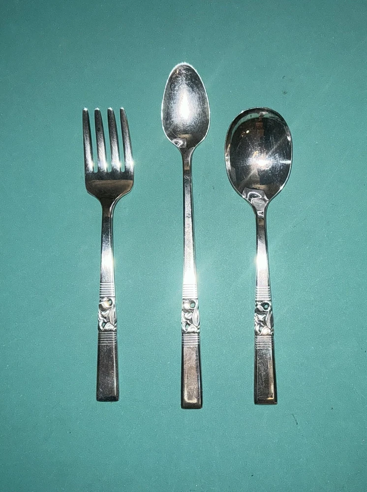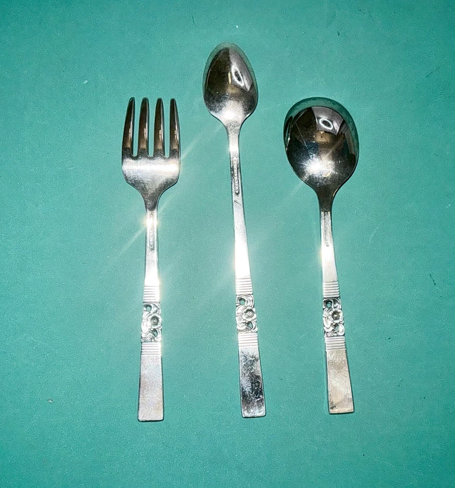 MORNING STAR Oneida Community Silverplate Baby 1-Fork & 2-Spoons 1948 Set of 3 Good condition Add a touch of elegance to your baby's mealtime with this beautiful set of three silverplate flatware pieces from Oneida Community. The set includes a fork, spoon, and teaspoon, all with the Morning Star pattern on the handles. The glossy finish and silver-plated material make this set a perfect addition to any family's collection. Your baby will love the Morning Star pattern, which is both charming and timeless. Make mealtime more enjoyable for both you and your little one with this exquisite set of flatware.