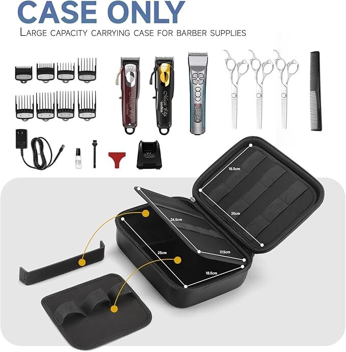 About this item ✃【Material&High Protection】For Barber clippers storage bag is made of durable EVA material, clippers for hair cutting case provides shock-proof, splash-proof, scratch-proof, and dust protection, safeguarding beards from potential damage. Soft interior lining offers added protection to delicate equipment like clippers kits, prolonging their lifespan. Frequent use by professional hairdressers or personal daily use, firm hair bags can reduce replacement frequency and save costs. ✃【Hair Clipper Organizer Excellent Protection】With mesh pocket and dividers, hair cutting kit bag can be used to store guide combs, charging cable, cleaning brushes, blade, oil, manual and other grooming accessories; Case for beard grooming kit not only collects accessories in one place, prevent them colliding and damaging, but also avoids it loss. Smooth and durable double zipper is easy to open and close hair trimmer for men storage, giving you a better use experience. ✃【Easy to Carry 】For Barber bag with a robust handle for comfortable carrying, making it easy to transport to any destination, whether for travel, business, or outdoor adventures. Meanwhile, hair clippers & accessories container also can be put in backpack and suitcase. Hair trimmer for men storage box with smooth zipper ensures seamless opening and closing, enhancing the ease of use and overall user experience. ✃🔥【Multifunctional Use】You can freely decide the usage as you wish like professional salon organizer, personal home storage, travel carrying bag, makeup kits pouch and more. It is a good choice for barber, salon, hair stylist, hairdresser, hairdressing amateur, makeup artist, and travel enthusiast.Size: (10.6 x 7.87 x 3.14 inch ) This bag can hold a variety of cosmetics, skincare products, nail art products, makeup brush set, jewelry, electronic accessories, toiletries, shaving kit, hair cutting kits and so on. 💕【A Unique and Thoughtful Gift 】Clipper organizer for barber not only is used by yourself, but also is gift choice for father, boyfriend and male friends. Clippers and trimmers set storage bag is suitable for Father's Day, Valentine's Day, Christmas and other festivals. If you are not satisfied with the product, please feel free to contact us, and we will solve it on time.
