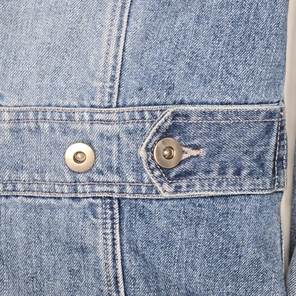 Elevate your wardrobe with this vintage style denim blazer from MOSSISSUE by MOSSIMO. This blazer features a classic, retro-inspired look that is perfect for any occasion, whether it's a casual day out or a business meeting. The blazer is made from high-quality cotton denim and features a button closure, notch flat lapels, and patch flap pockets. The blazer is a size small and has a regular fit, making it perfect for most body types. It is machine washable and can be worn in any season. With its timeless style and solid pattern, this blazer is a must-have addition to any fashion-forward woman's wardrobe. It has silver hardware and a fitted silhouette. This blazer is a one of a kind must have! It's measurements are 17" front chest and 24" length. It is made of 100% cotton.