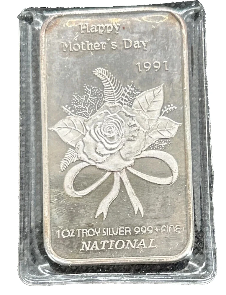 MOTHERS DAY 1991 NATIONAL 1 OUNCE .999 FINE SILVER BAR has some scratches