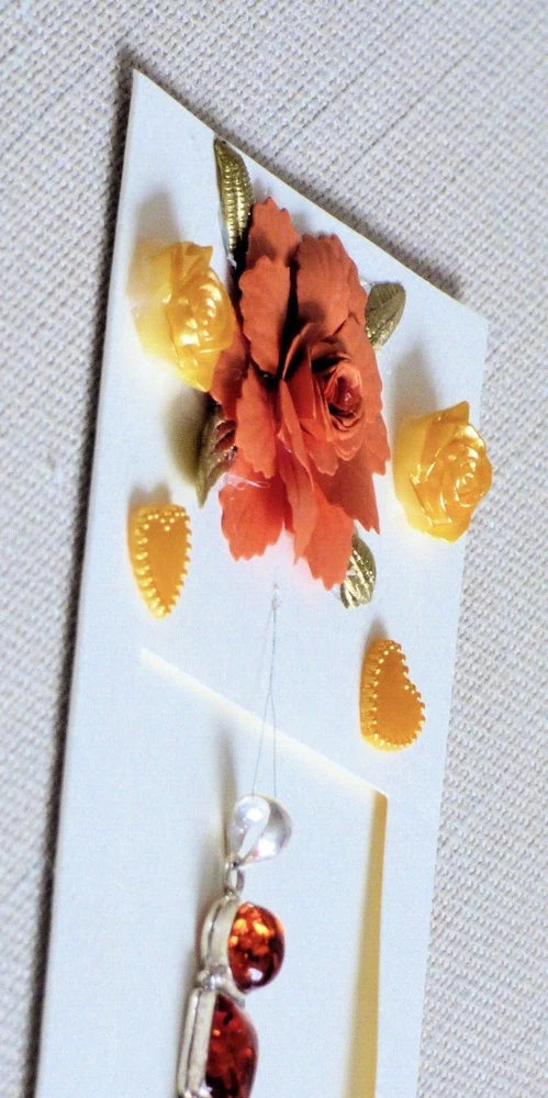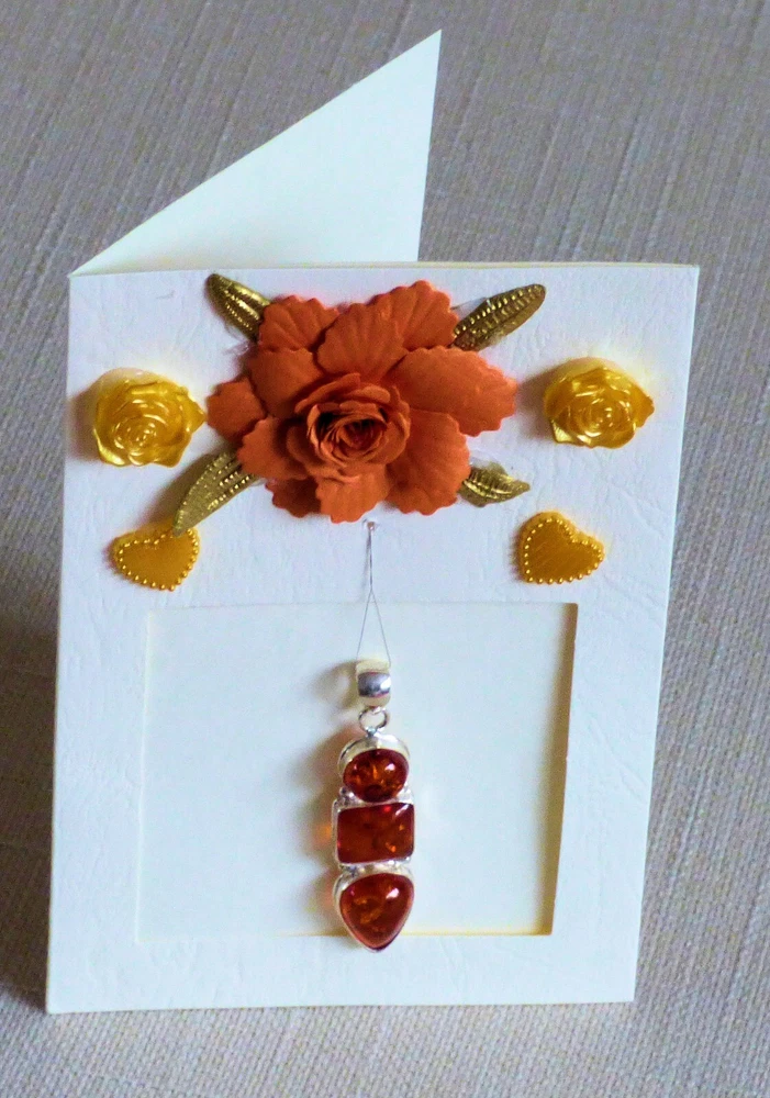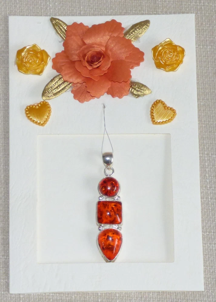Amber Pendant Necklace - 925 Sterling Silver Chain - Blank Card - CHRISTMAS GIFT Supplied with a cream card and envelope. The cream coloured card is decorated with orange and gold coloured flowers and two gold coloured beaded hearts. Would make a lovely Birthday or Mothers Day Gift. WILL POST TO UK MAINLAND ONLY.