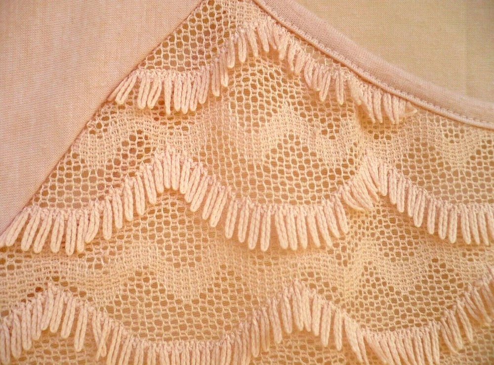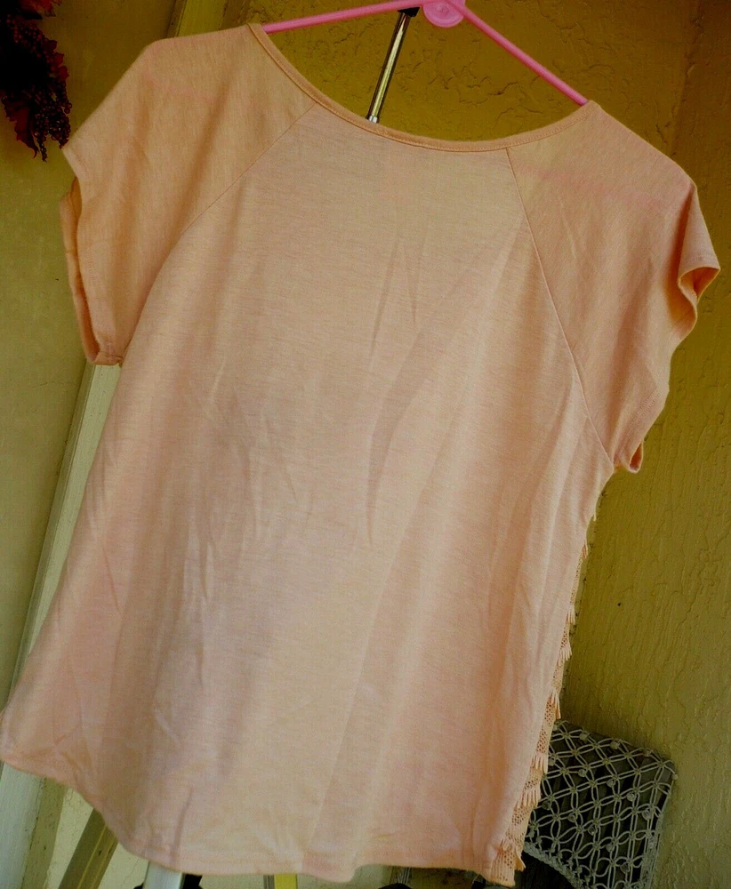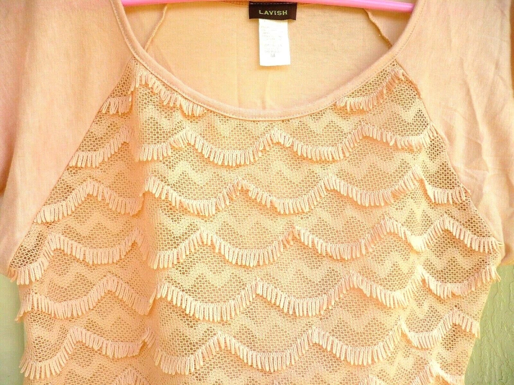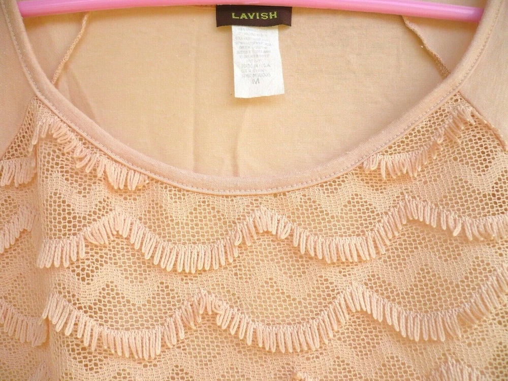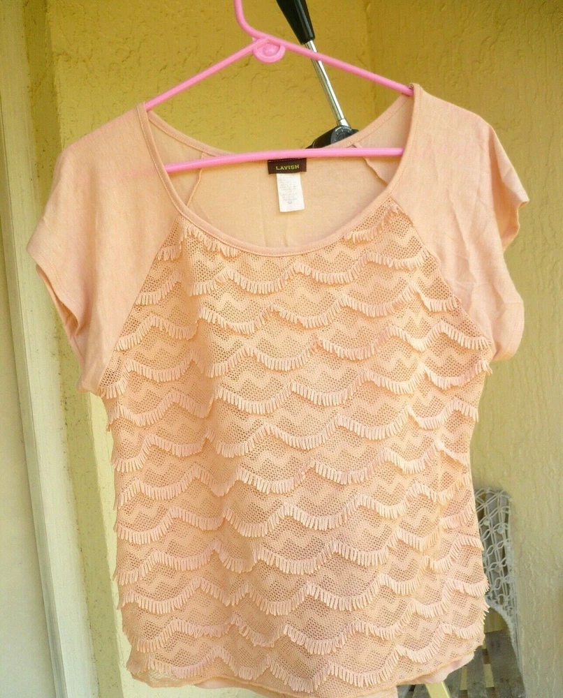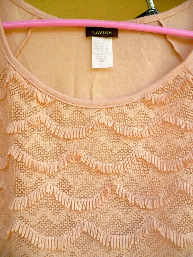 THIS IS A SOMEWHAT LIGHT PEACH KNIT TOP WITH CROCHET-LIKE LACE SCALLOPS (WITH NETTING IN BETWEEN) IN FRONT. (SLEEVES & BACK ARE PLAIN). LABELS SAY: LAVISH, 46% POLYESTER, 46" RAYON, 8% SPANDEX, MADE IN USA, MACHINE WASH, SIZE: M. MEASUREMENTS ARE: BUST: 40", WAIST: 39", HIPS (TAKEN AT BOTTOM), SHOULDER TO SHOULDER (BACK); 16", LENGTH: 21.5". NO STAINS OR FADING OR RIPS.