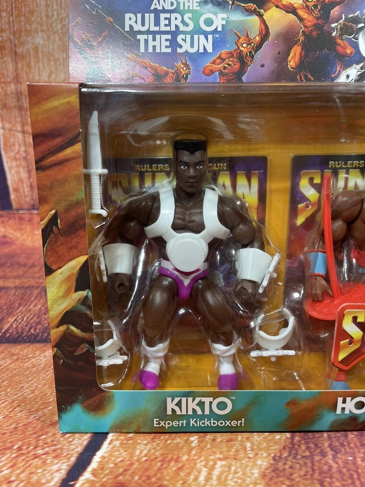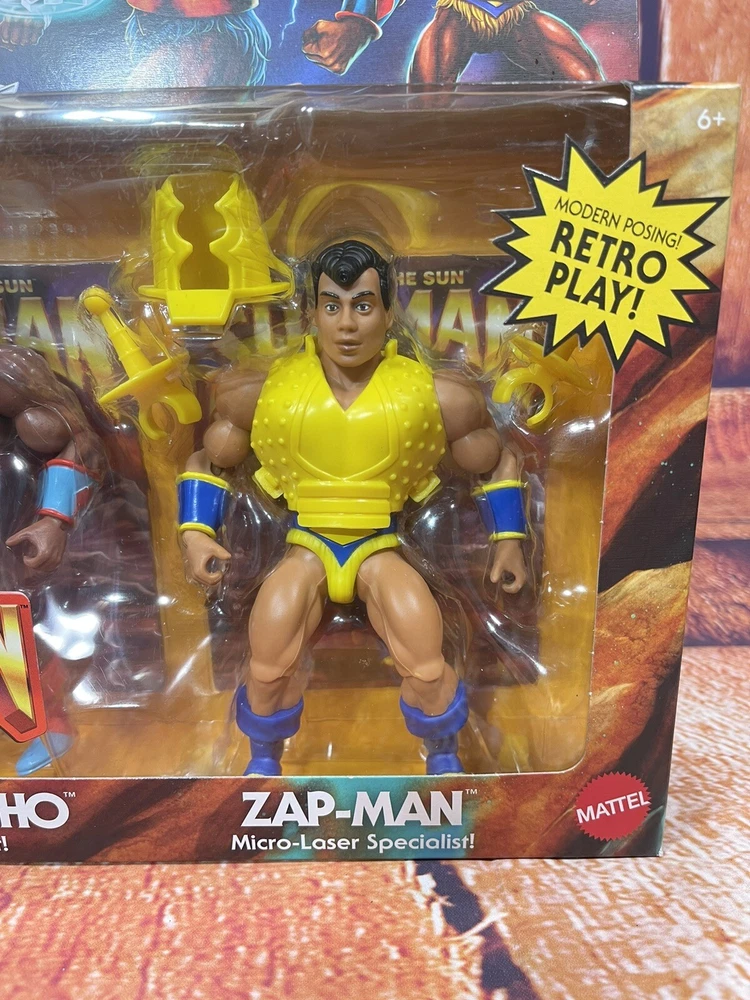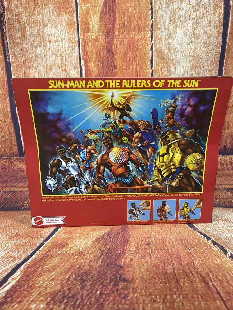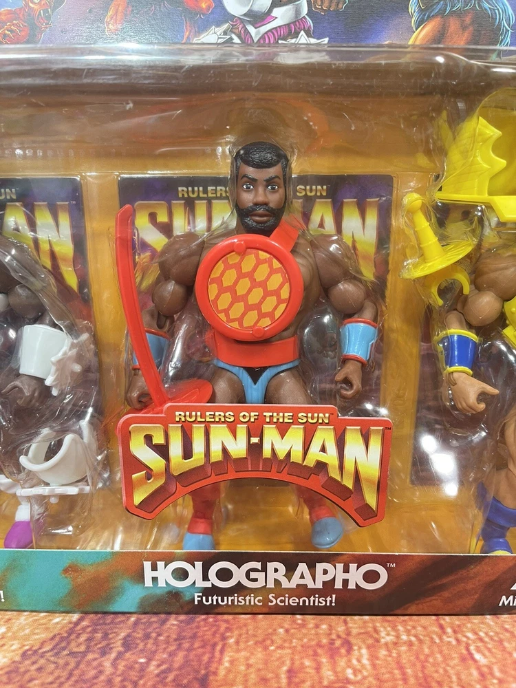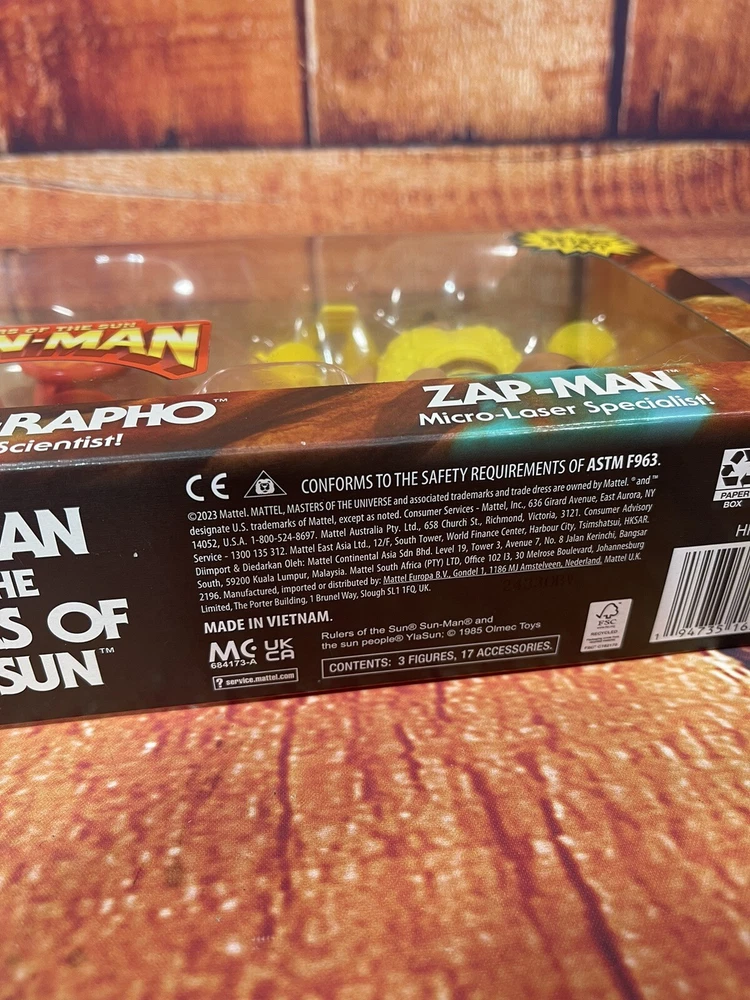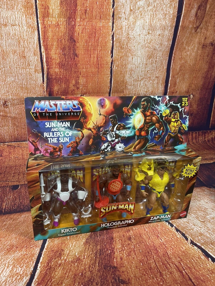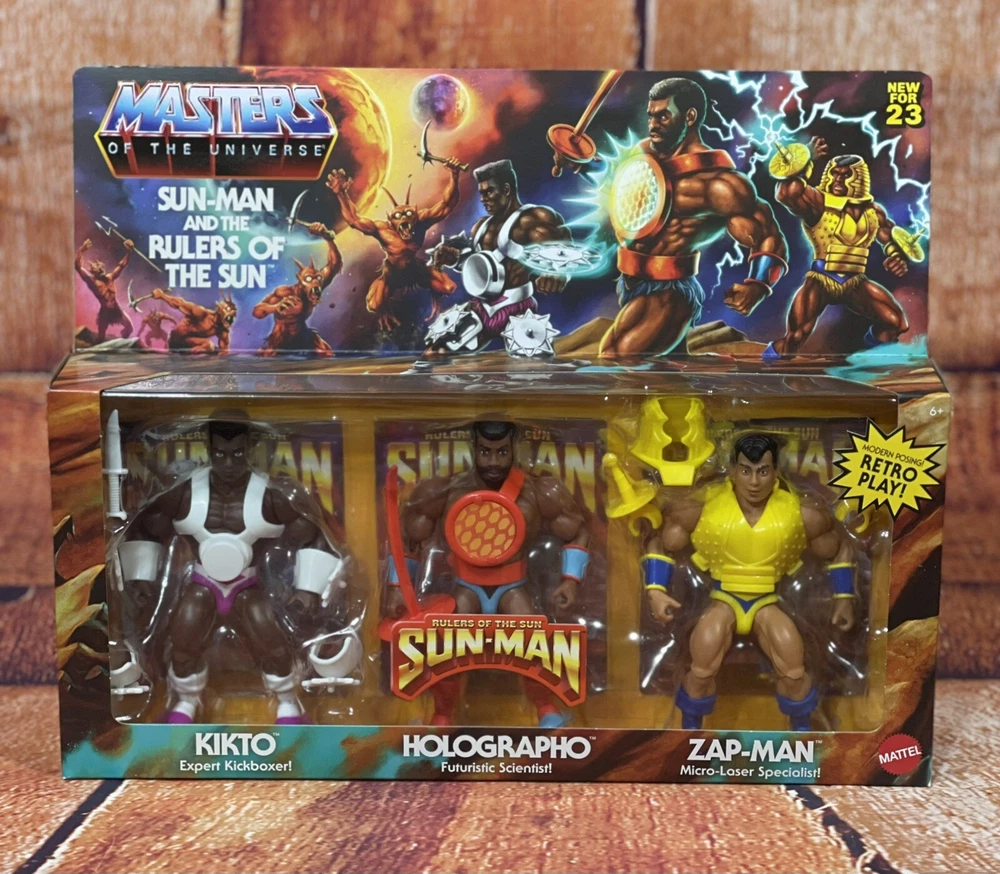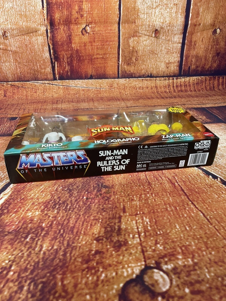 This action figure 3-pack features the beloved characters Sun-Man and Rulers of the Sun from the Masters of the Universe franchise. The figures are made of PVC, ABS plastic, and plastic materials and stand at a height of 12 inches with an item length of 2.5 inches and item width of 15 inches. The set is a 1:12 scale and comes boxed with adjustable features and clothes. The animated series Masters of the Universe is commemorated with this original, unautographed, non-vintage, and newly manufactured toy set licensed by Mattel. The set is crafted with exquisite detail and multicolor design by 20th Century Animation and made in Vietnam. Suitable for children aged 5-7 years, this cartoon and TV character-themed action figure set is a perfect addition to any toy collection.