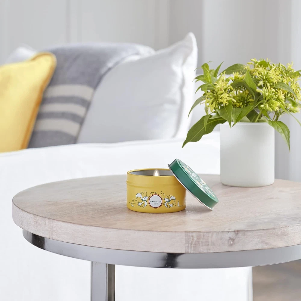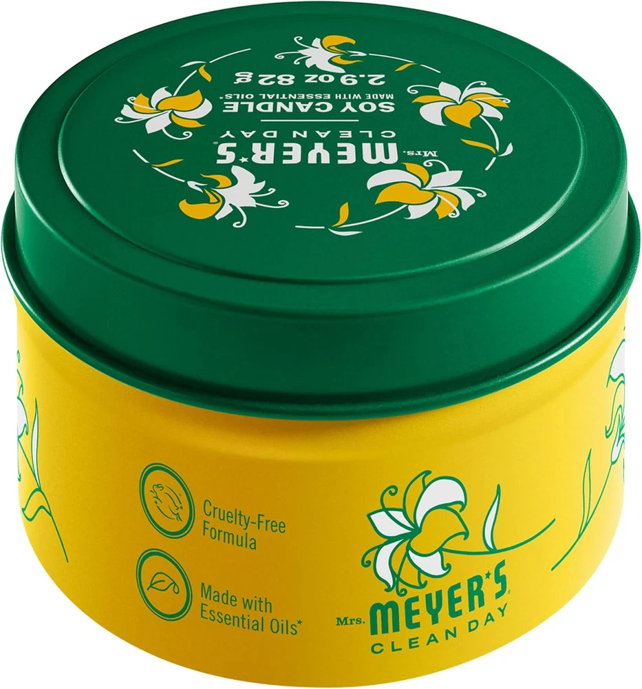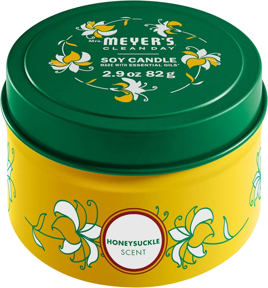 MRS. MEYER'S CLEAN DAY Soy Tin Candle, 12 Hour Burn Time, Single, Honeysuckle Product Details Brand: MRS. MEYER'S CLEAN DAY Color: Honeysuckle Product Dimensions: 2.96"W x 1.83"H Item Weight: 0.18 Pounds Number of Items: 1 Scent: Honeysuckle Are Batteries Included: No Indoor/Outdoor Usage: Indoor Specific Uses For Product: Aromatherapy Shape: Round Material: Soy Wax Container Material: Tin Occasion: Travel Seasons: All Season Special Feature: Long Burning Style: Honeysuckle Wick Quantity: 1 Model Name: Tin Candle Theme: Fruit Package Information: Can Product Care Instructions: Trim wick to 1/4 inch before each lighting. Burn candle 2-3 hours at one time. Keep away from drafts. Do not burn more than 4 hours. Recycle tin container after use. Material Type Free: Cruelty-free Unit Count: 2.9 Ounce Embellishment: Long burning Material Feature: Plant-Based Candle Type: Container Candle Size: Single Manufacturer: SC Johnson Part Number: 311651 Item Weight: 2.88 ounces Country of Origin: USA Item model number: 311651 Special Features: Long Burning Batteries Included?: No Batteries Required?: No Product Dimensions : 2.96 x 2.96 x 1.83 inches; 2.88 ounces Item model number : 311651 Manufacturer : SC Johnson Country of Origin : USA Brand: MRS. MEYER'S CLEAN DAY Color: Honeysuckle Product Dimensions: 2.96"W x 1.83"H Item Weight: 0.18 Pounds Number of Items: 1 Scent: Honeysuckle Are Batteries Included: No Indoor/Outdoor Usage: Indoor Specific Uses For Product: Aromatherapy Shape: Round What's cleverly contained in our Honeysuckle Tin Candle? The garden-inspired scent of honeysuckle It's made with essential oils, plant-derived soy wax and other thoughtfully chosen ingredients Long-lasting fragrance Soy Candle with a lead-free wick that gives you 12 hours of smooth burn time, and with a cruelty-free formula, of course Cruelty-free formula, of course It's a long burning candle with a lead-free wick. That gives you twelve hours of smooth burn time If you could make household chores more pleasant, well, why wouldn't you? Just light up a Mrs. Meyer's Clean Day Honeysuckle Candle, and you'll be doing just that. Oh joy! In a moment, tempting sweet and enticing honeysuckle scent is all around. A charming mix of flowers and fruits. So serene and sunny! These soy candles are made with plant-derived wax, essential oils and other thoughtfully chosen ingredients and come in delightful decorative tins. They look just darling, and also make great gifts. You'll have plenty of time to clean or relax, while enjoying the garden-inspired scent: the lead-free wick has a 12-hour burn time. And to make what's already great even better, you can choose from a bunch of other garden-inspired scents, as well as products such as body lotions, laundry detergents, soap, tin candle holders, and more. Mrs. Meyer's - Rooted in Goodness.