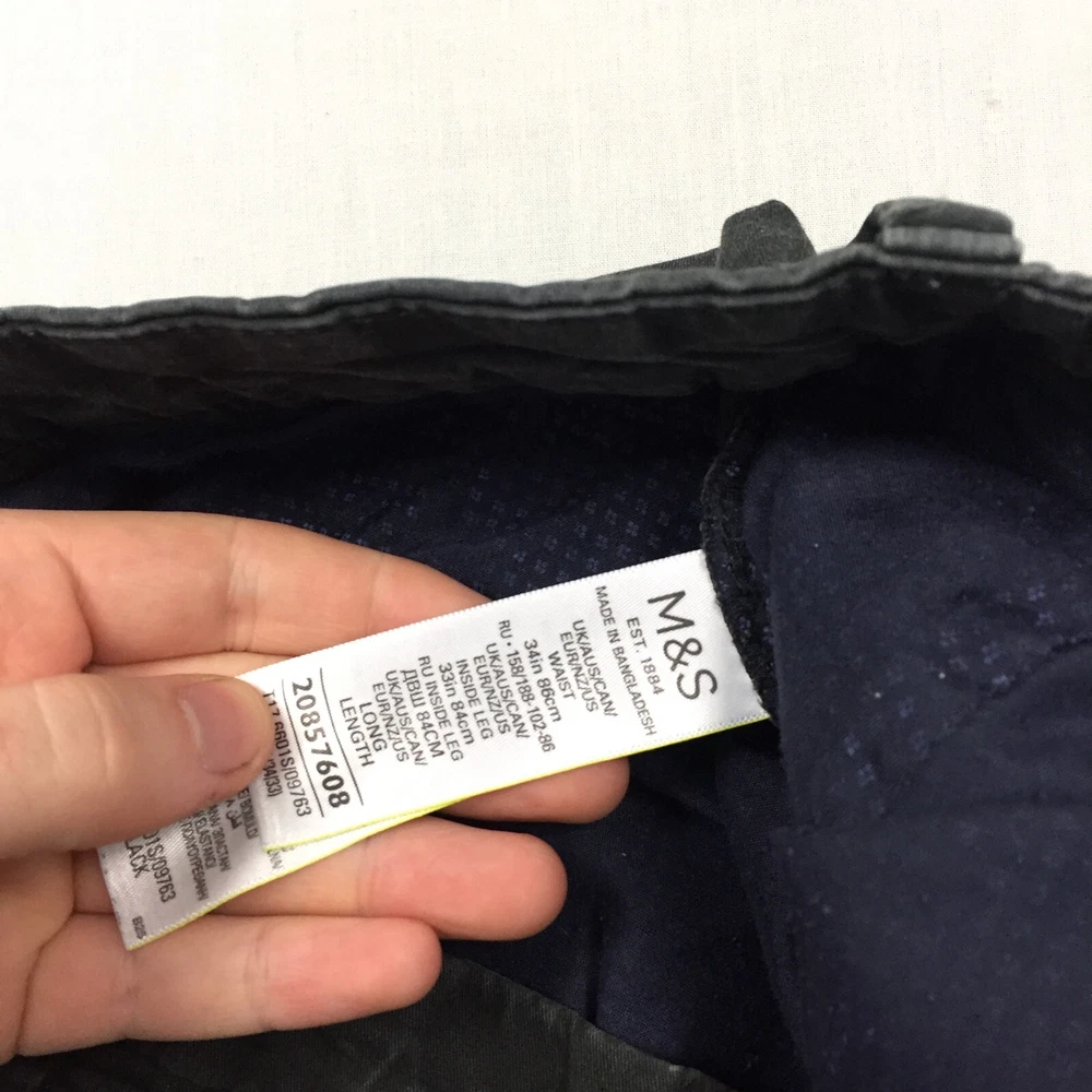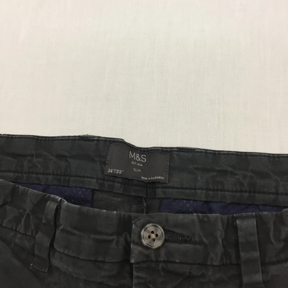Pattern: No Pattern Fabric Type: Canvas Colour: Black Waist Size: 34 in Country/Region of Manufacture: Unknown Inside Leg: 30 in Pocket Type: Coin Pocket Occasion: Business, Casual, Travel Leg Style: Straight Seller Notes: “Good used condition, check below for full description & photos.” Garment Care: Machine Washable Vintage: No Material: Cotton Blend Size: 34 Department: Men Season: Autumn, Spring, Summer, Winter Handmade: No Size Type: Regular Type: Trousers Closure: Button Accents: Button Style: Chino Brand: Marks & Spencer Personalise: No Fit: Regular Rise: Mid (10-12 in)