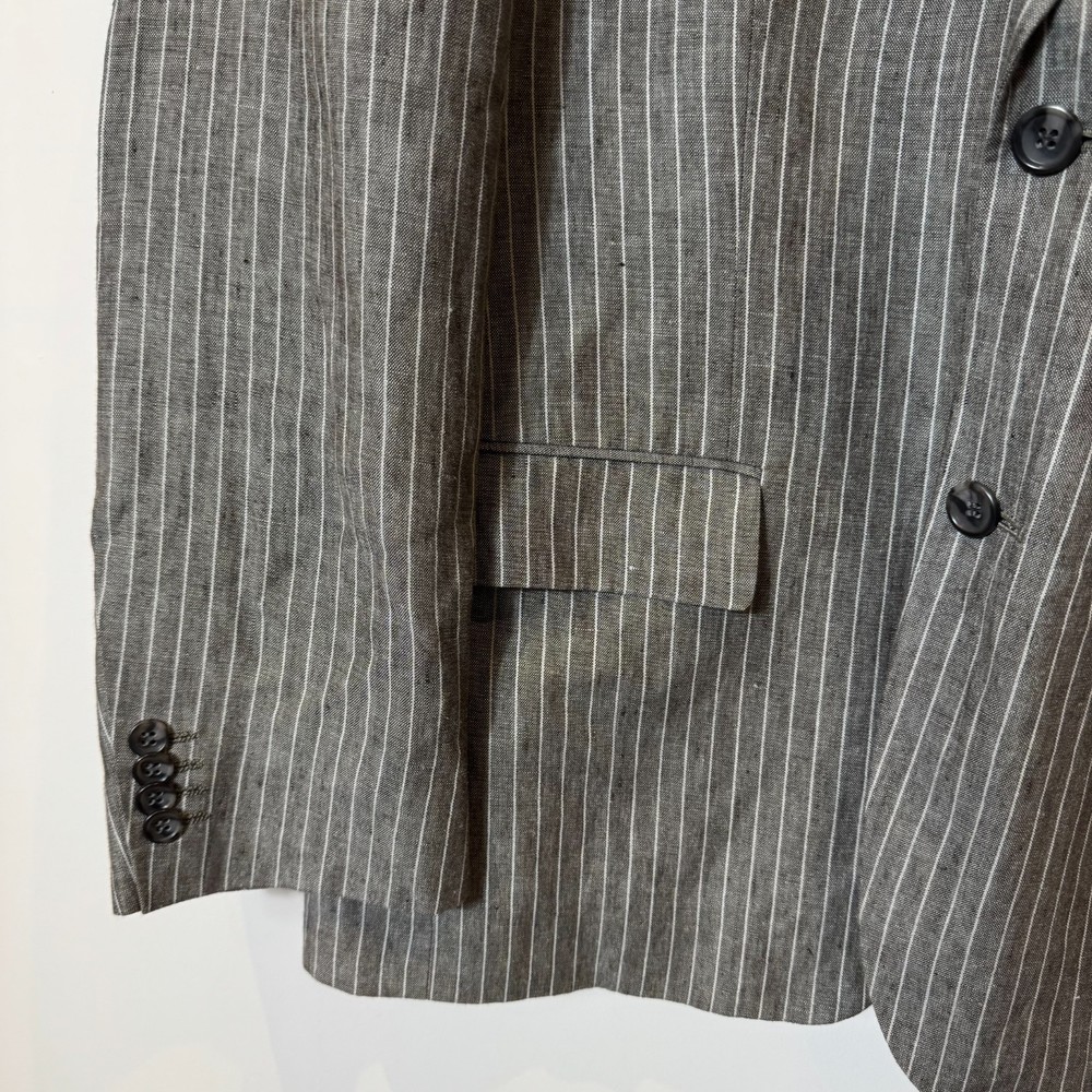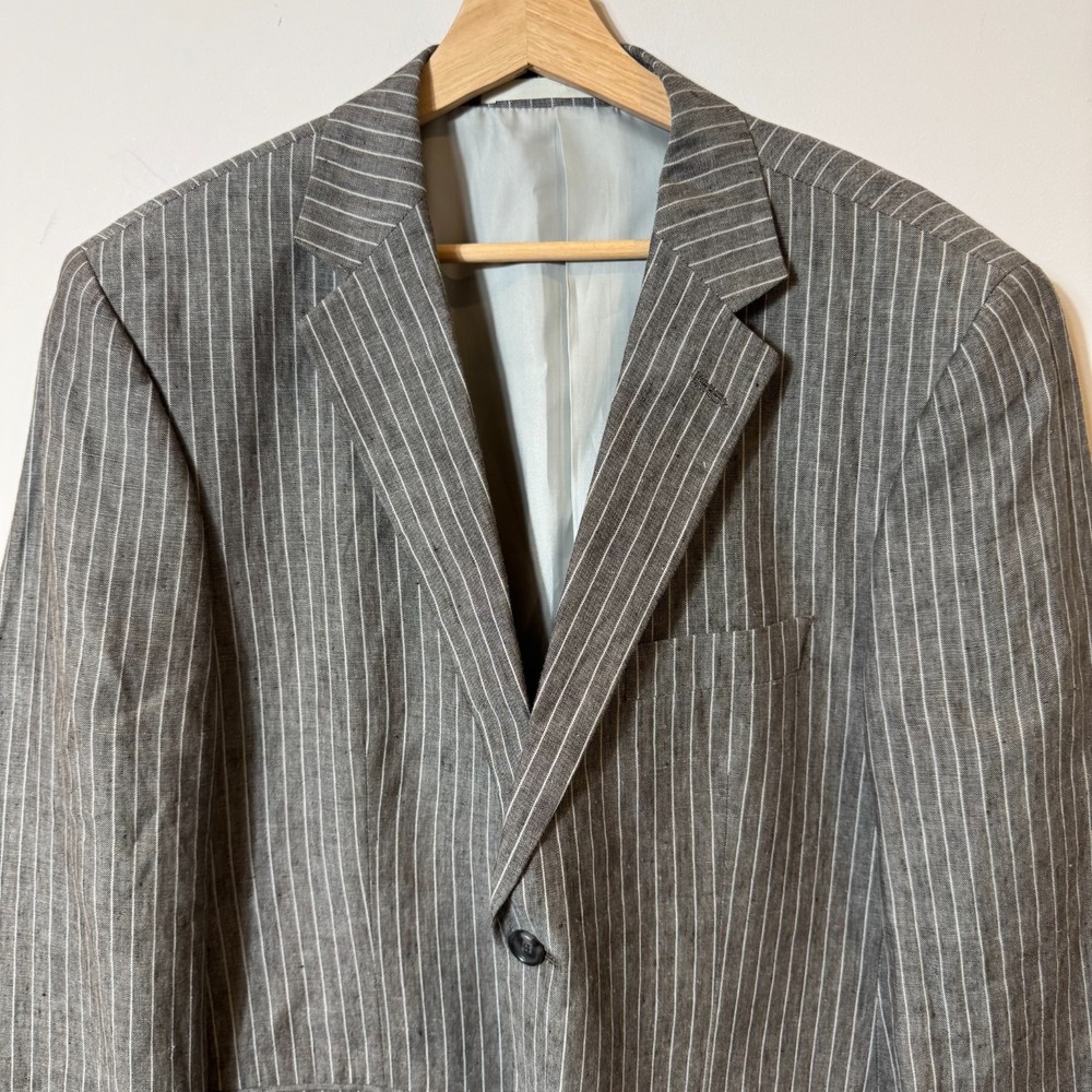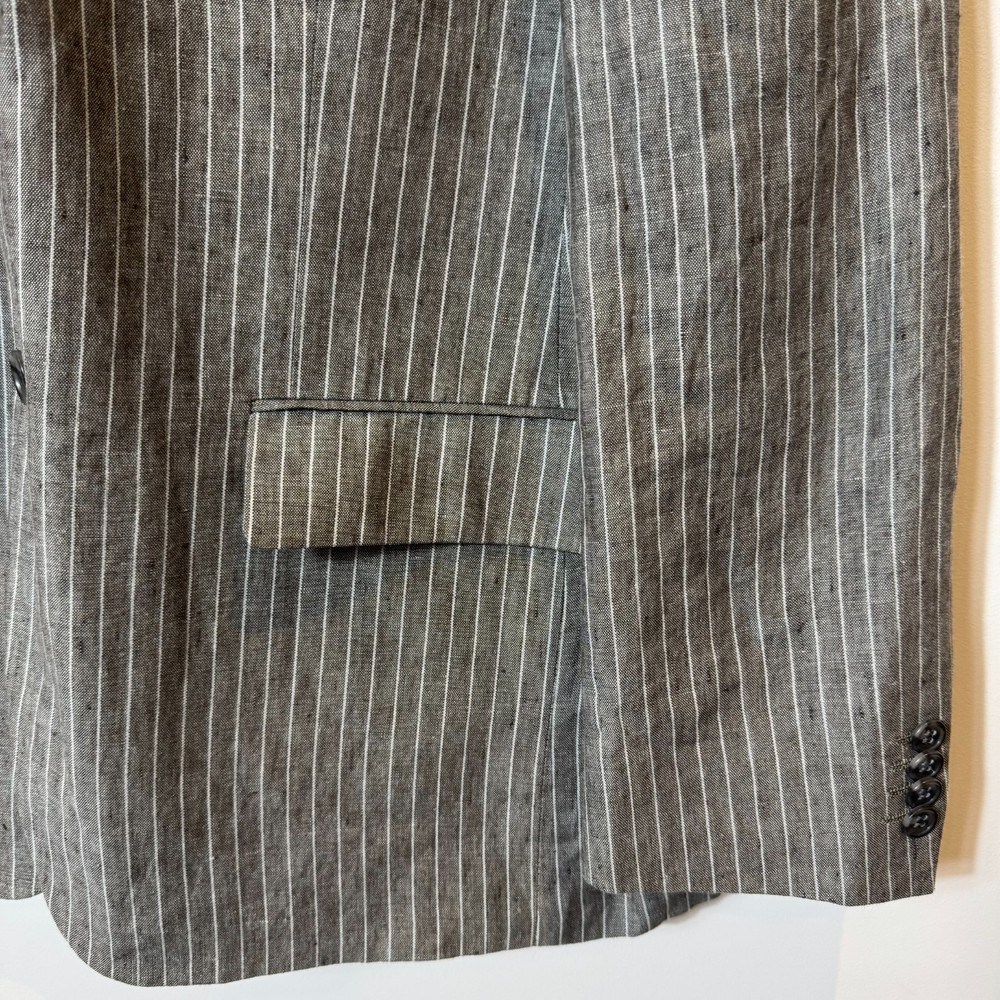 M&S Collezione Pure Linen Pinstripe Blazer Size 42 Short Smart grey/brown pinstripe blazer from the M&S Collezione range, crafted from pure linen using Italian fabric by Nova Fides (Prato, Italy). Lightweight and breathable — ideal for spring and summer events, weddings or smart casual styling. 📏 Size Labelled: 42 Short (42SHT) Approx measurements: Pit to pit: ~20–21 inches Length: ~30-31 inches (Please compare with a similar jacket for best fit.) 🧵 Fabric Outer: 100% Linen (Flax) Body Lining: 100% Polyester Sleeve Lining: 53% Viscose / 47% Polyester 🔎 Details Single breasted Pinstripe pattern Rear vent Button cuff detail Fully lined Italian woven fabric ✨ Condition Very good pre-owned condition. No major rips or structural damage. Light natural linen creasing (normal for fabric).