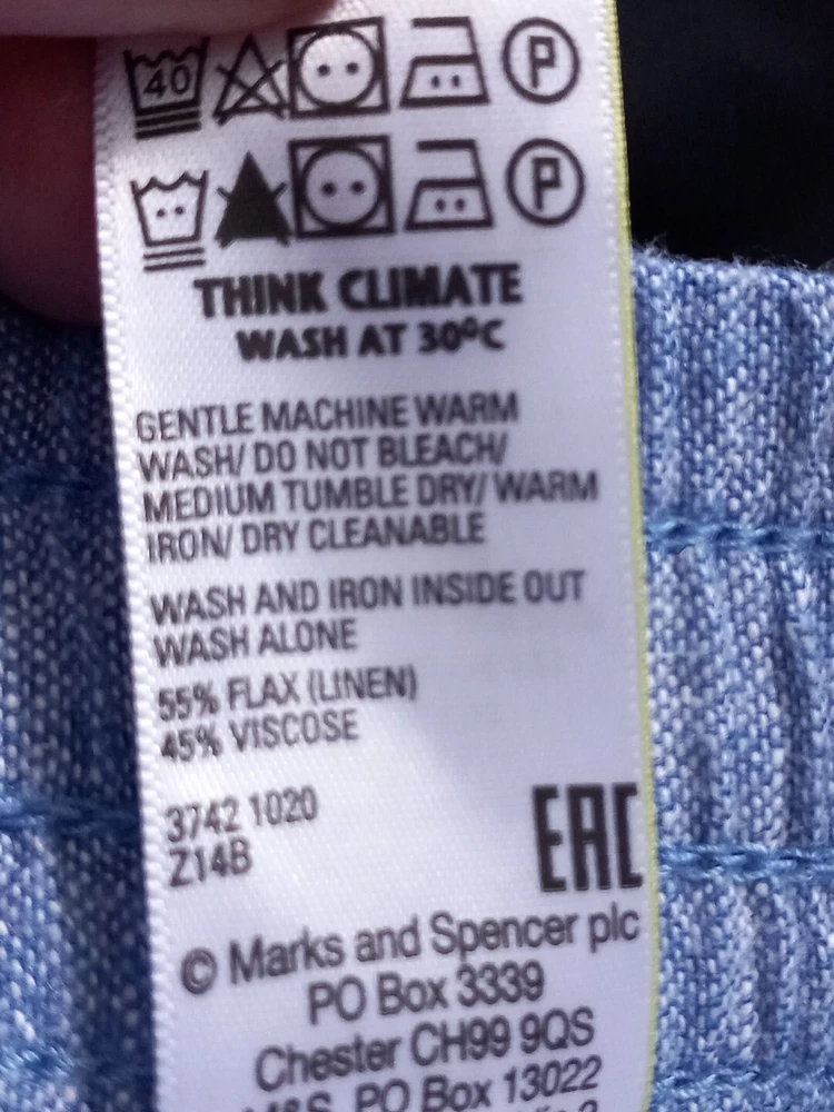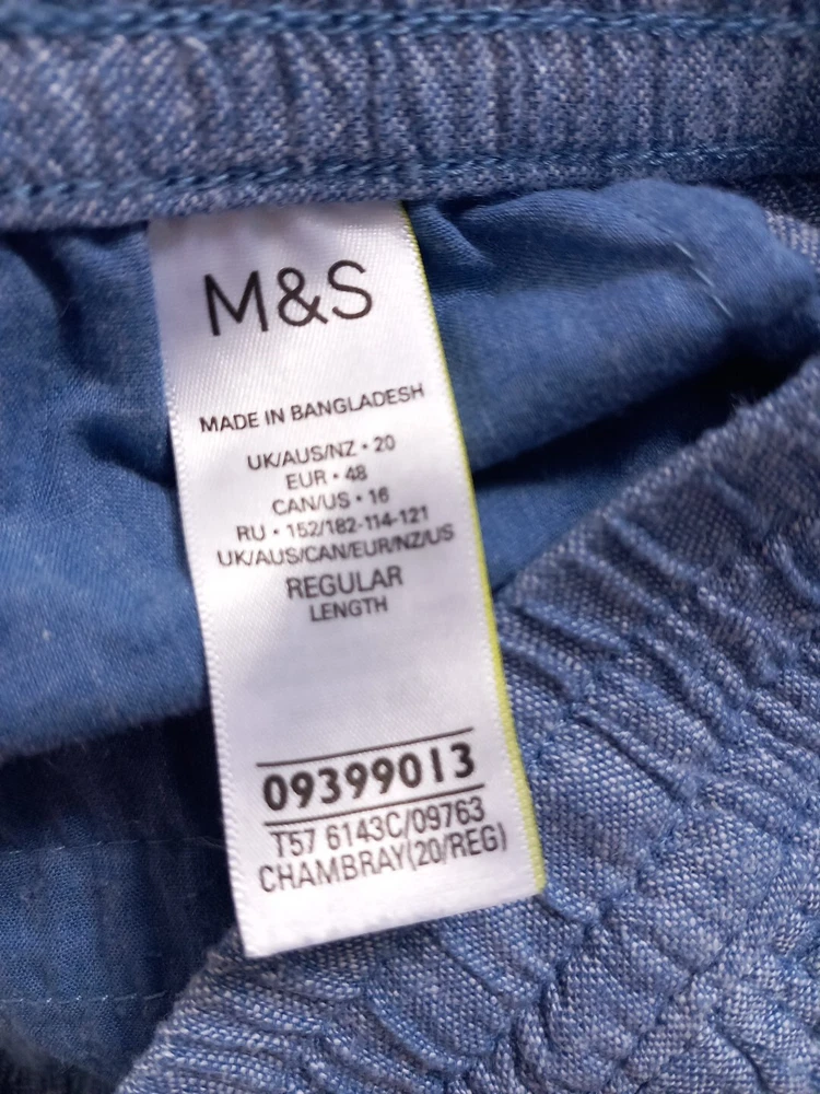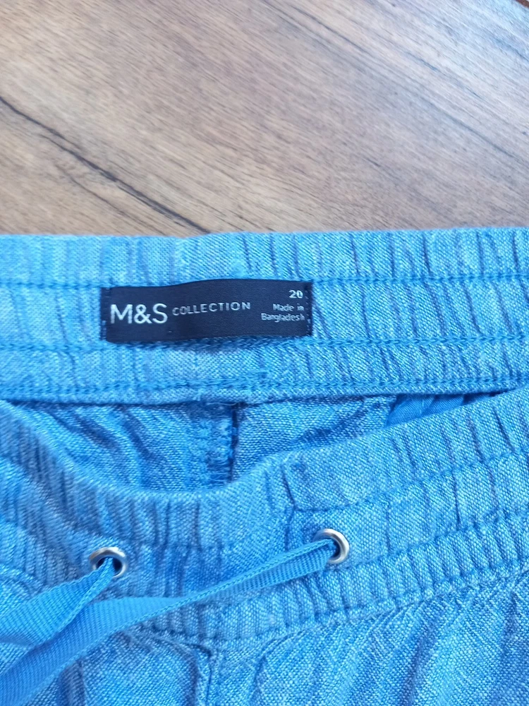 Season: Autumn, Spring, Summer, Winter Leg Style: Straight Handmade: No Model: N/A Size Type: Regular Features: Elastic Waist Rise: Mid (8.5-10.5 in) Theme: Art, Beach Personalise: No Colour: Blue Front Type: Flat Front Fit: Regular Brand: Marks and Spencer Material: Linen, Viscose Waist Size: 41 in Pattern: No Pattern Garment Care: Machine Washable Vintage: No Inside Leg: 29 in Type: Trousers Closure: Drawstring Style: Jogger Fabric Type: Chambray Country/Region of Manufacture: Bangladesh Accents: Elasticated Waist Department: Women Occasion: Casual, Travel, Workwear Size: 20