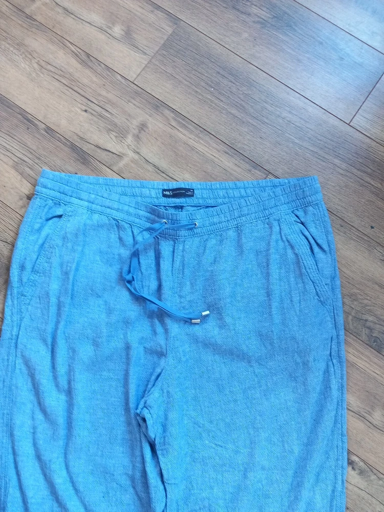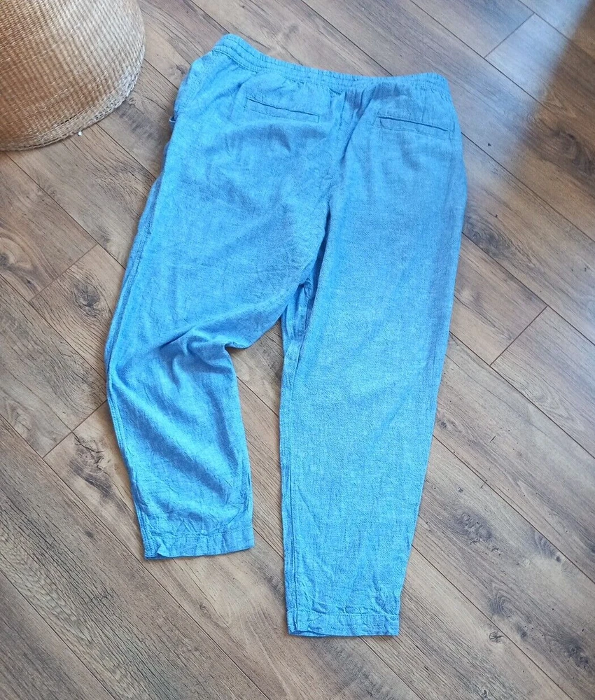 M&S Linen Blend Jogger Trousers Chambray Blue Elastic Waist Size UK 18