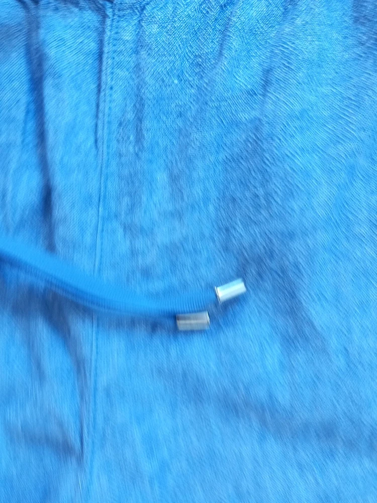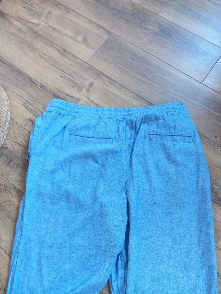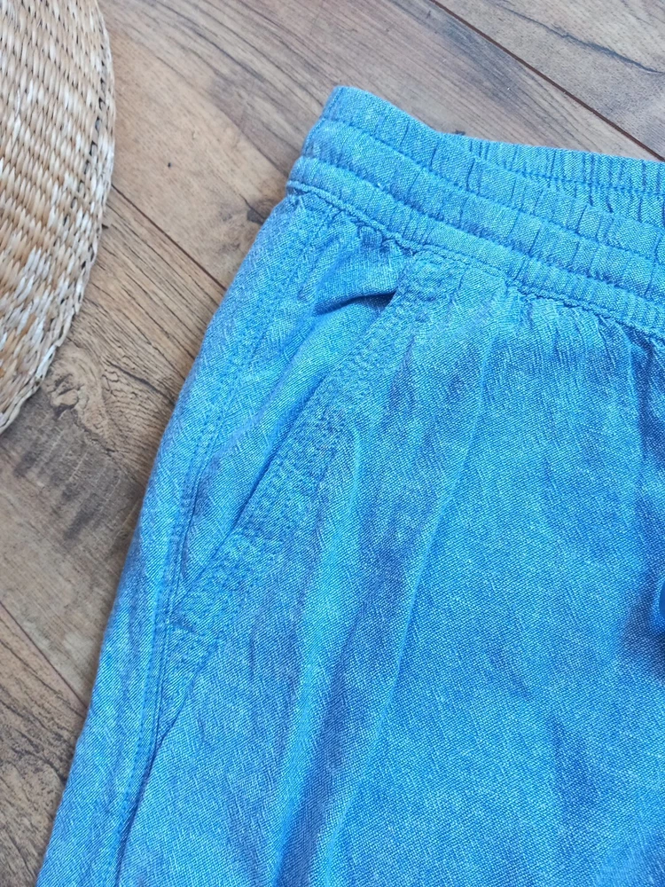 Good used condition with no faults found. Chambray blue linen blend trousers. 55% Flax linen, 45% viscose. Measures 20" across elasticated waist unstretched, 26" across hip area approx, 14" rise, 29" inside leg, 7" across hems.