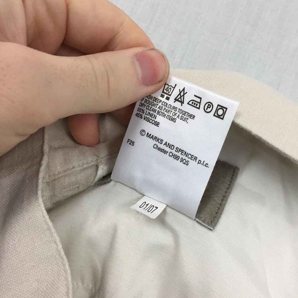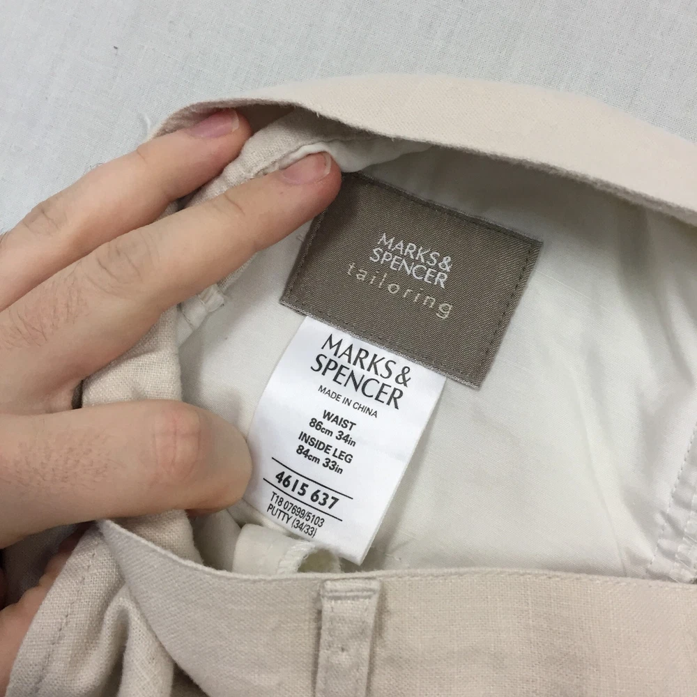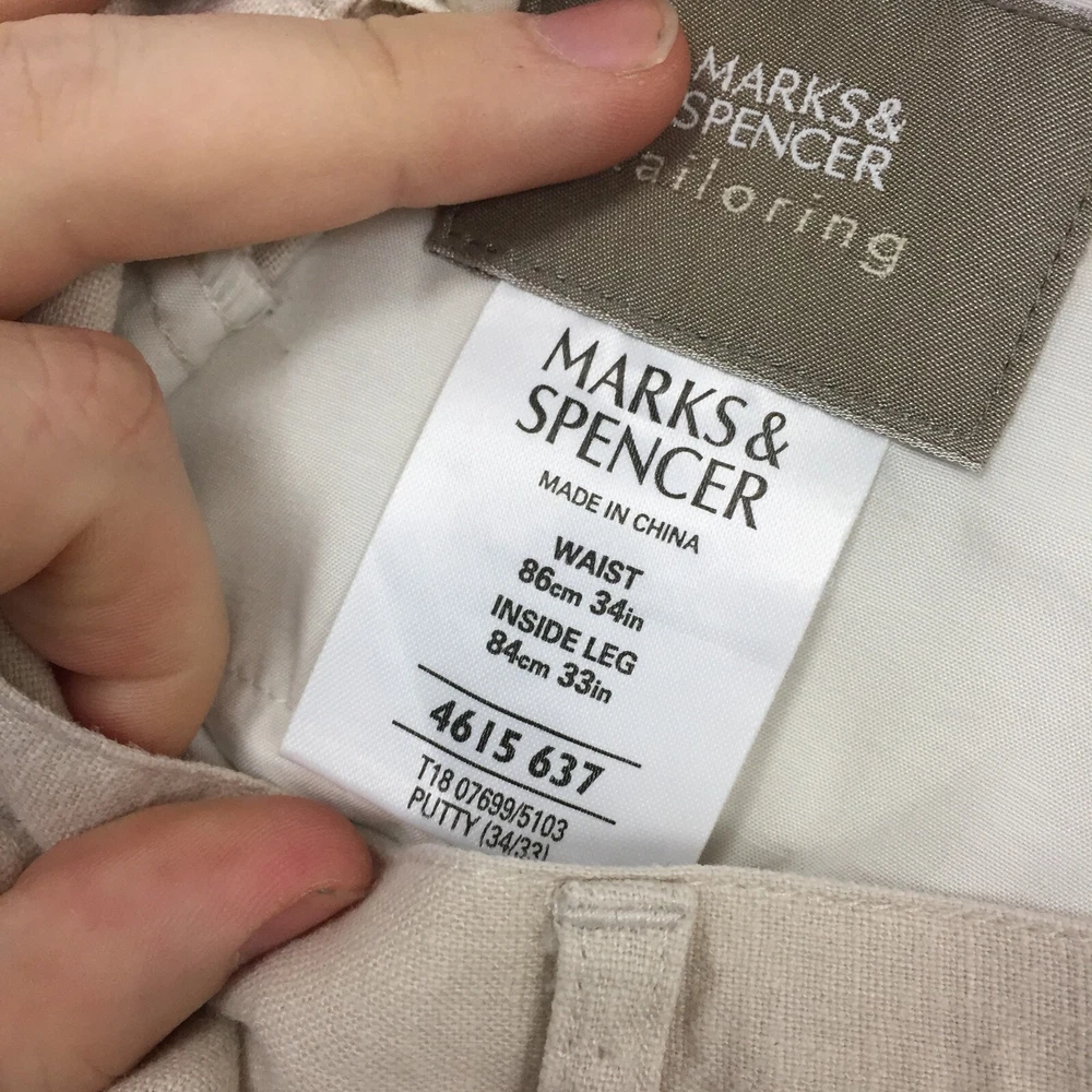 Fit: Regular Pocket Type: Coin Pocket Rise: Mid (10-12 in) Colour: Beige Waist Size: 34 in Closure: Button Pattern: No Pattern Handmade: No Brand: Marks and Spencer Department: Men Leg Style: Straight Size: 34 Accents: Button Inside Leg: 33 in Occasion: Business, Casual, Travel Seller Notes: “Good used condition, check below for full description & photos.” Size Type: Regular Type: Trousers Country/Region of Manufacture: Unknown Fabric Type: Canvas Season: Autumn, Spring, Summer, Winter Material: Linen Style: Chino Garment Care: Machine Washable Vintage: No Personalise: No