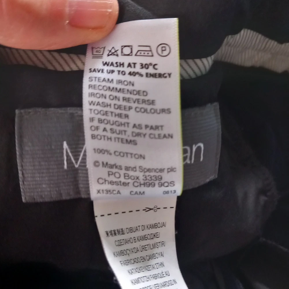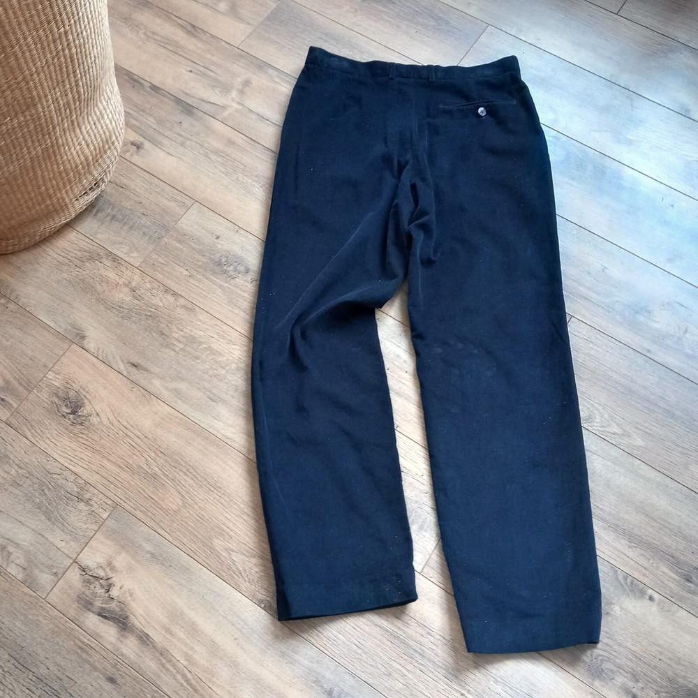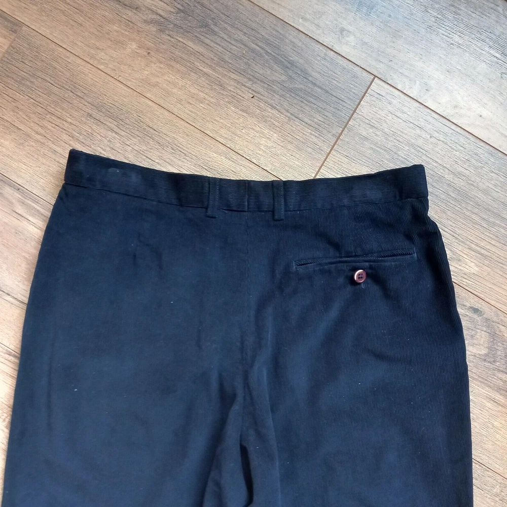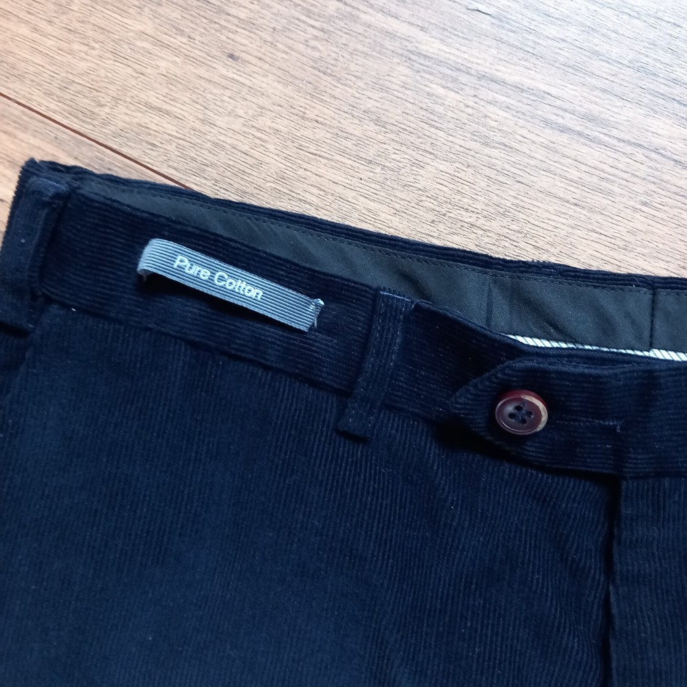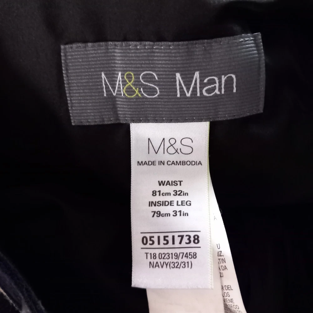 Dont think these were actually ever worn but the tags are removed - cotton label still on the front. Dark blue fine cord trousers in classic design from M&S Man. Measures 16" across waist, 30" long inside leg. 100% cotton.