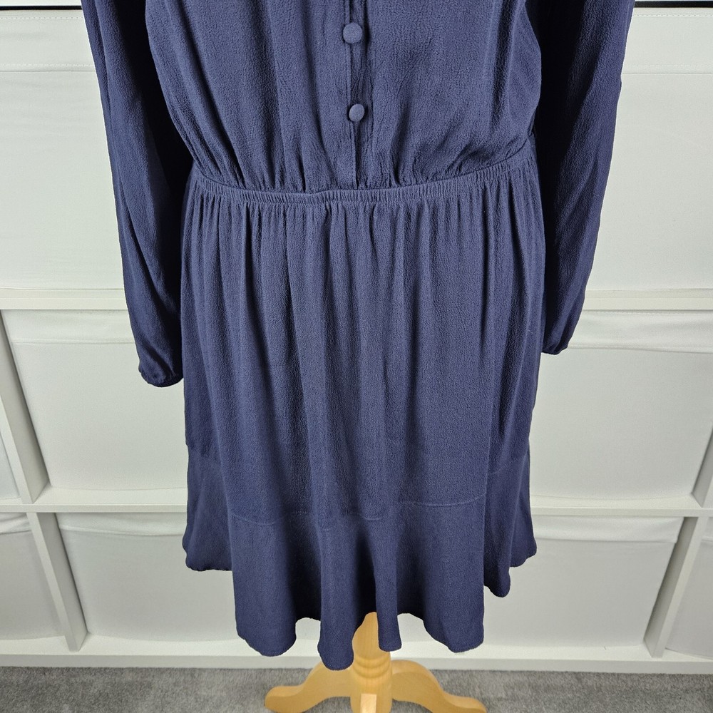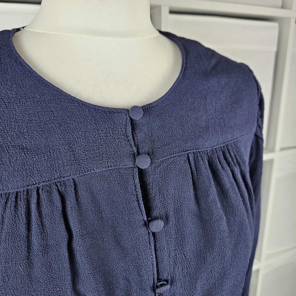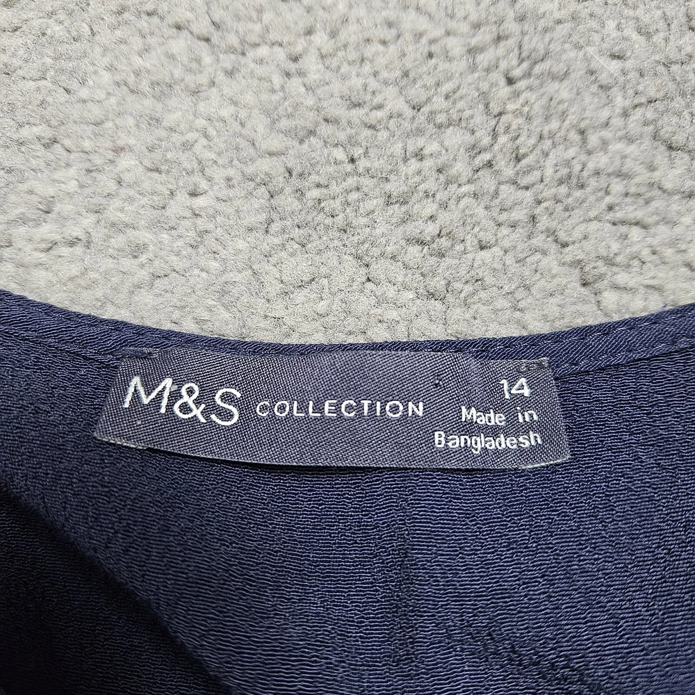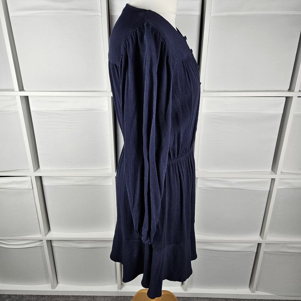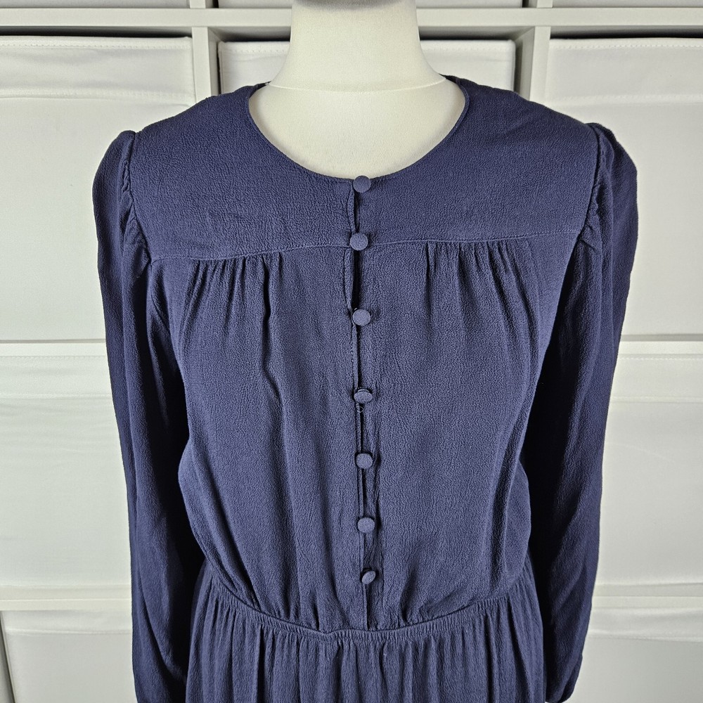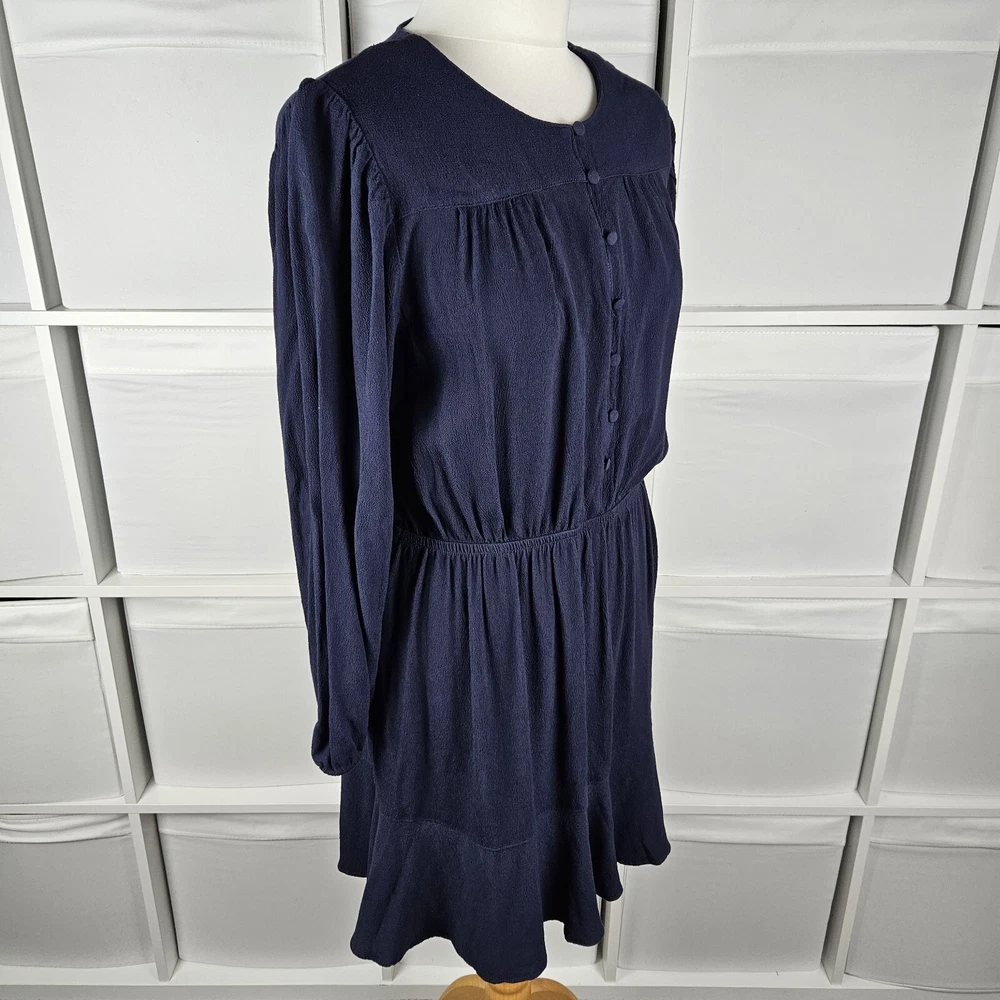 M&S navy long sleeve dress, size 14. Pretty dress with elasticated waistband and cuffs, button down top, and A-line skirt with a flare hem. Versatile style, suitable for daytime, work or dressed up for an evening out. In good used condition. Approximate Measurements in inches: Armpit to armpit: 20 Waist: 14 laid flat, stretches to 19 Length: 34