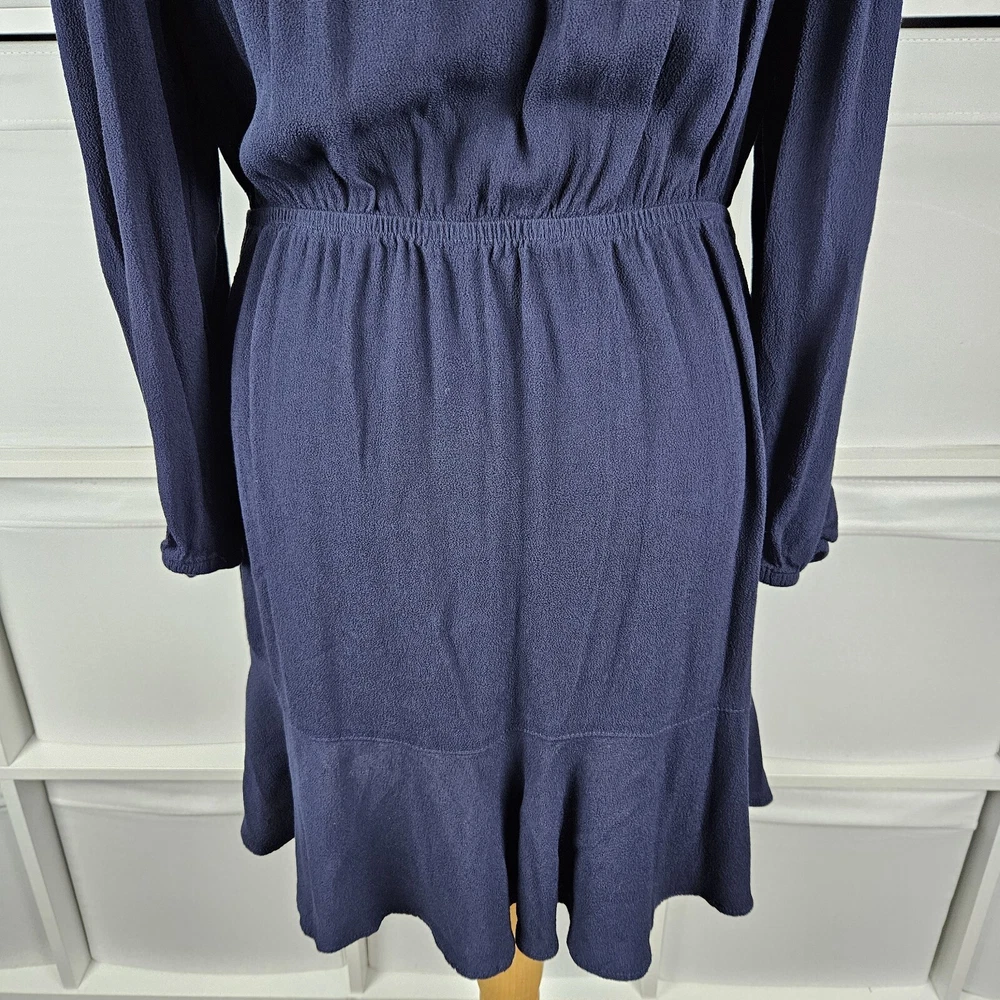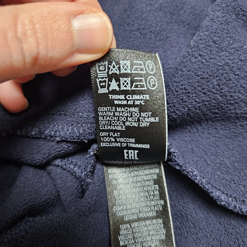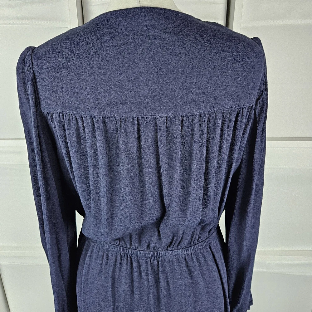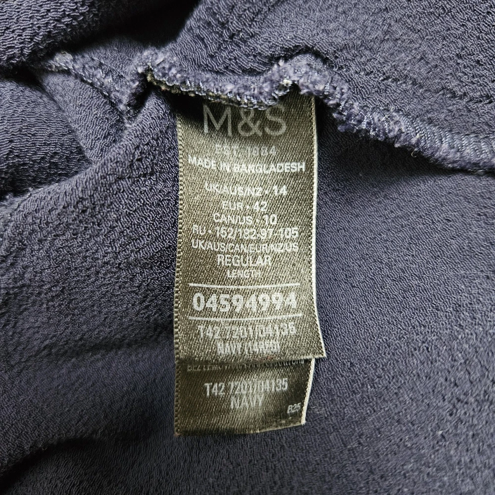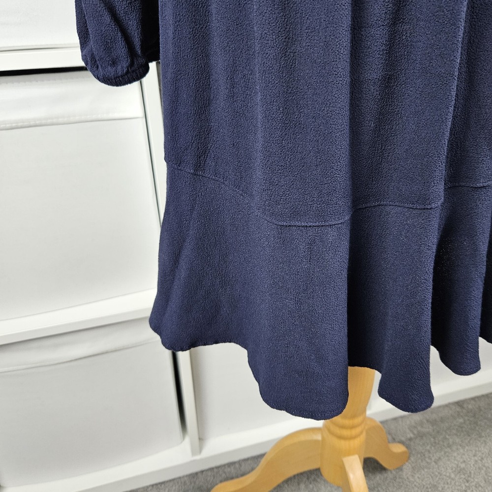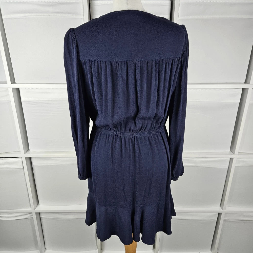M&S navy long sleeve dress, size 14. Pretty dress with elasticated waistband and cuffs, button down top, and A-line skirt with a flare hem. Versatile style, suitable for daytime, work or dressed up for an evening out. In good used condition. Approximate Measurements in inches: Armpit to armpit: 20 Waist: 14 laid flat, stretches to 19 Length: 34