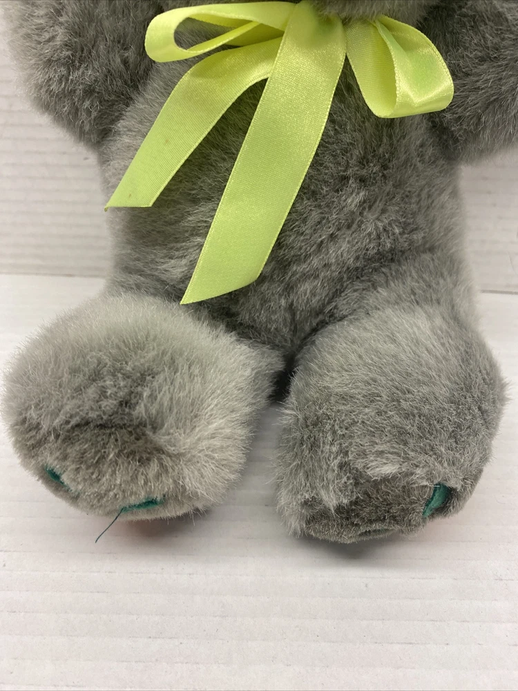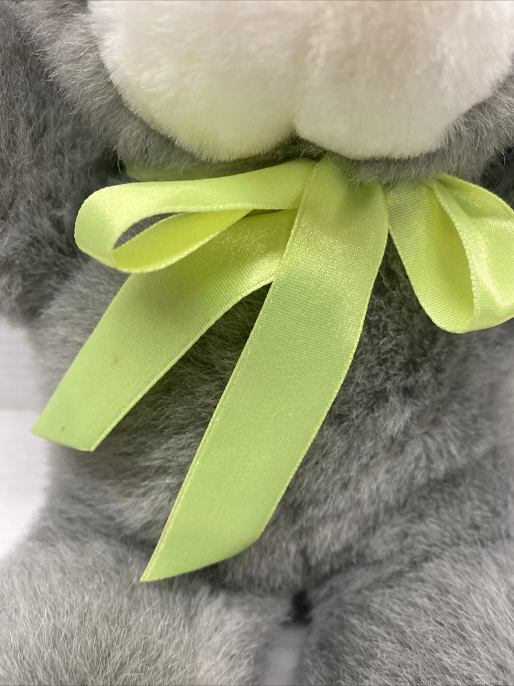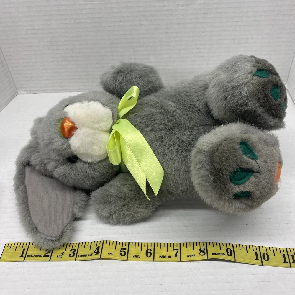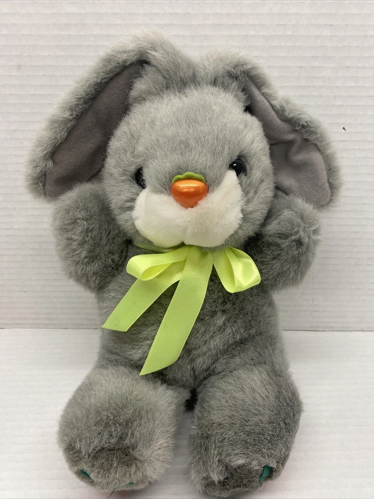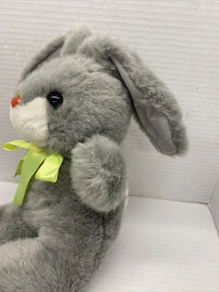 M.S. Toys Grey Plush Bunny Rabbit 10" with Carrot NOSE and Feet Green bow Easter See all photos for exact size and condition